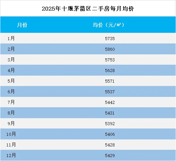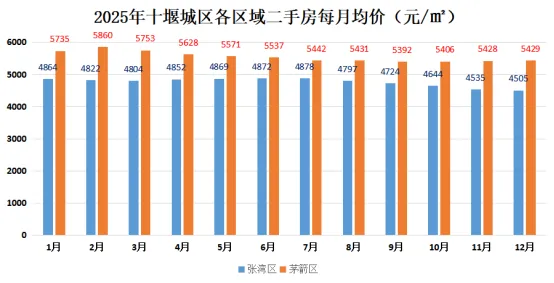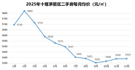 从全年表现来看,茅箭区二手房均价从年初 5735 元 /㎡降至年末 5429 元 /㎡,累计下跌 306 元 /㎡,跌幅 5.34%。尽管跌幅高于城区平均水平,但考虑到其初始均价基数较高,且在市场下行期仍能快速实现价格修复,充分印证了核心区域房产的价值稳定性。