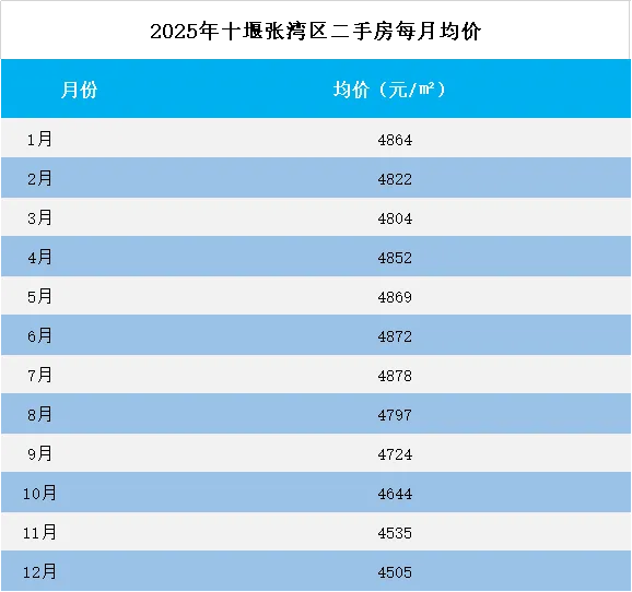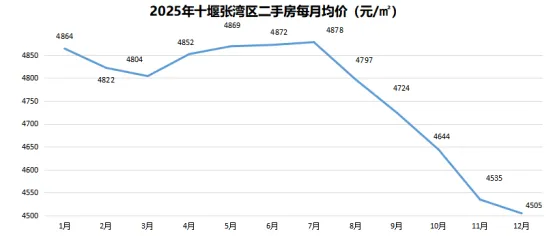 2025 年张湾区二手房均价走势呈现 “前稳后跌” 的鲜明特征:1-7 月价格始终在 4800-4880 元 /㎡区间小幅波动,呈现企稳态势,7 月达到全年高点 4878 元 /㎡,成为全年唯一持续平稳运行的阶段;从 8 月开始,受新房供应增加、二手房挂牌量上升及需求不足的多重影响,价格进入梯式下跌通道,每月均呈现环比下降趋势,12 月跌至全年最低点 4505 元 /㎡,较 7 月高点下跌 373 元 /㎡,跌幅 7.65%;整个下半年未出现明显的回调迹象,市场调整压力持续释放。