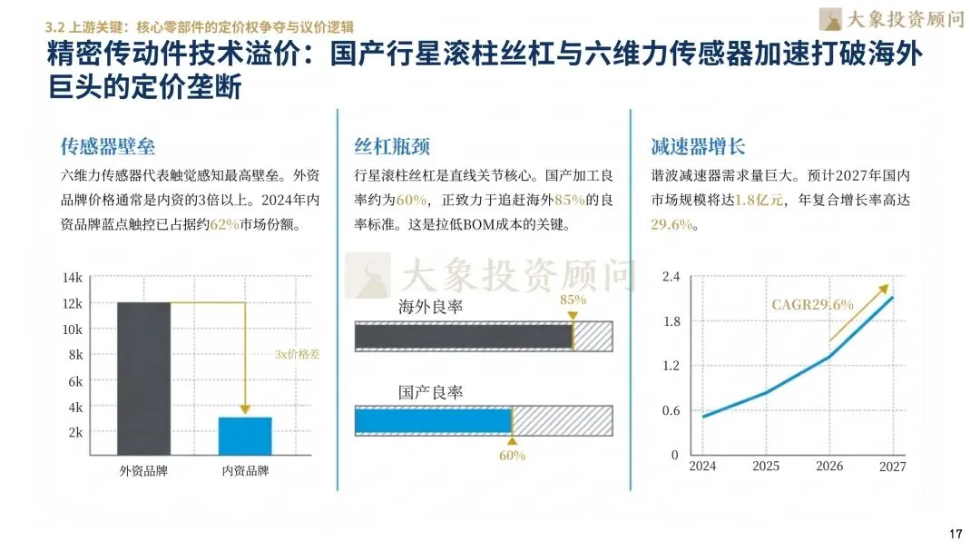 人形机器人的BOM(物料清单)成本结构揭示了产业链的价值高地。高精度传感器(占比27%)与精密丝杠(占比15%)共同占据了近42%的价值权重,是产业链中最具技术溢价和护城河的环节。目前,国产替代正在这些关键环节取得重大突破。例如,在触觉感知的最高壁垒——六维力传感器领域,国产内资品牌蓝点触控已占据约62%的市场份额,打破了外资品牌高出3倍的定价垄断。而在直线关节的核心件行星滚柱丝杠上,国产加工良率正从60%向海外85%的标准追赶,这将是未来进一步拉低整机成本、掌握议价权的关键。