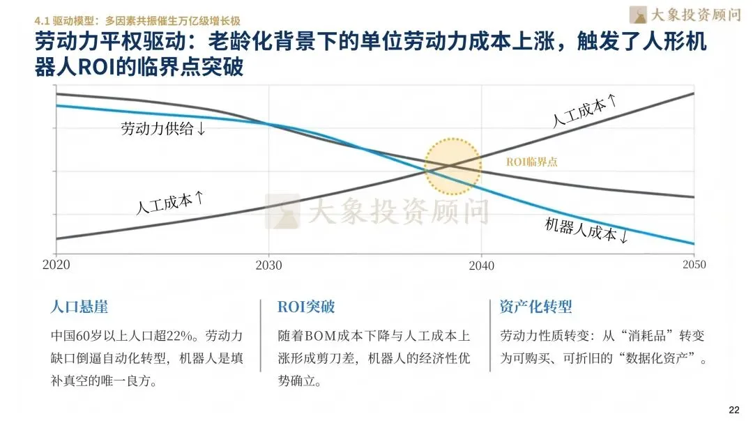 人形机器人在汽车制造等工业领域的首落点逻辑已非常清晰,核心在于其展现出的“非线性经济效益”。在工业试炼场中,一台人形机器人通过多班次执行,可替代约3.5至4名工人。随着BOM成本下降与人工成本上涨形成“剪刀差”,人形机器人的经济性优势日益凸显。预计到2029年,当机器人单体成本降至22万元左右时,将触发ROI(投资回报率)的临界点突破。这意味着人形机器人的角色将发生本质转变:从企业的一项“生产消耗品”,转变为一种可购买、可折旧且具备持续进化能力的“数据化资产”。