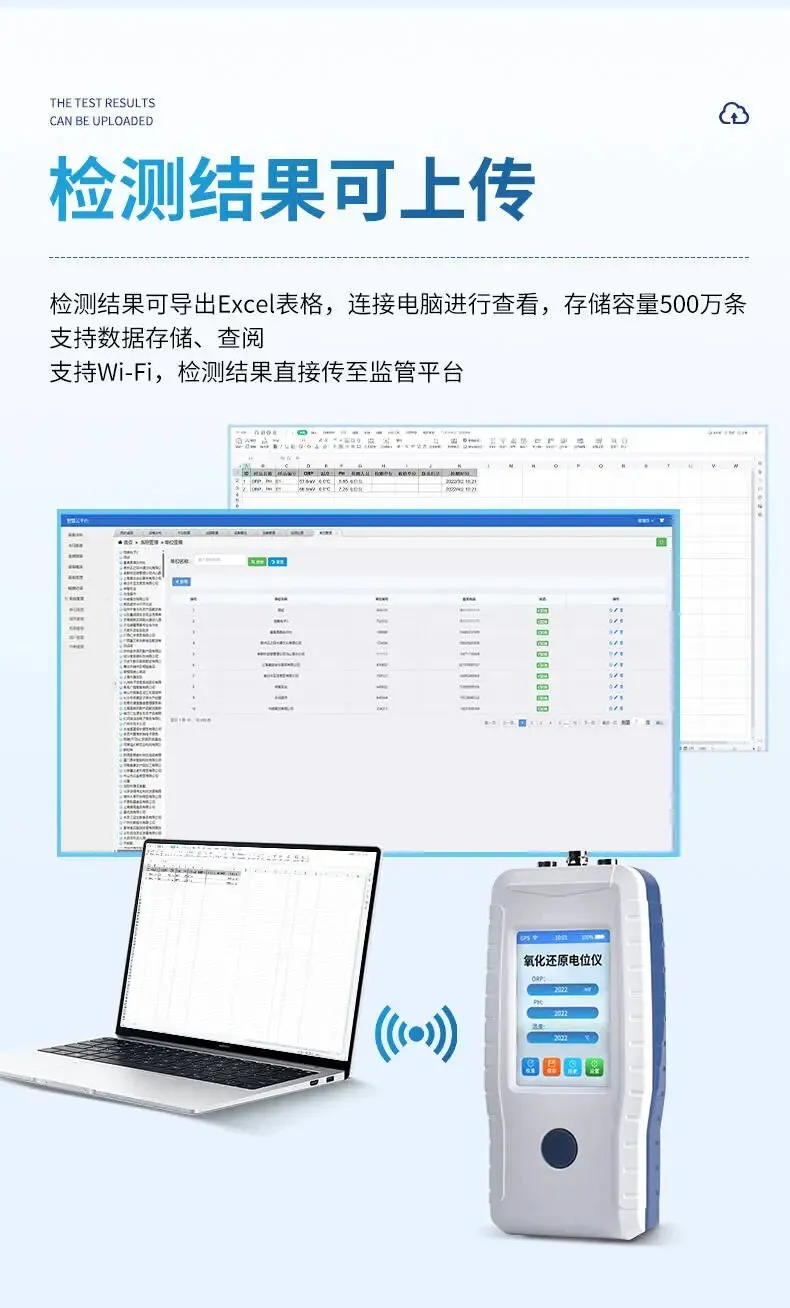 - 数据管理:支持500万条数据存储,可查阅、导出Excel,连接电脑或上传至监管平台。