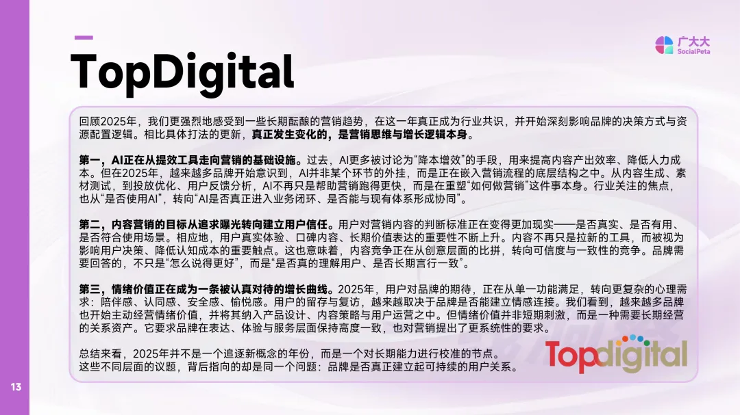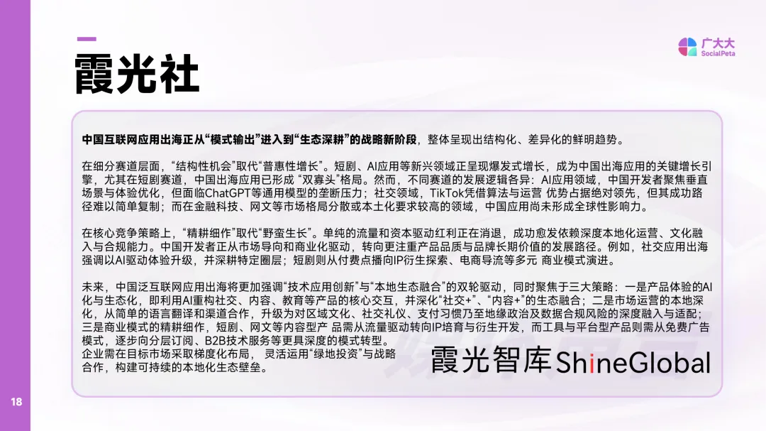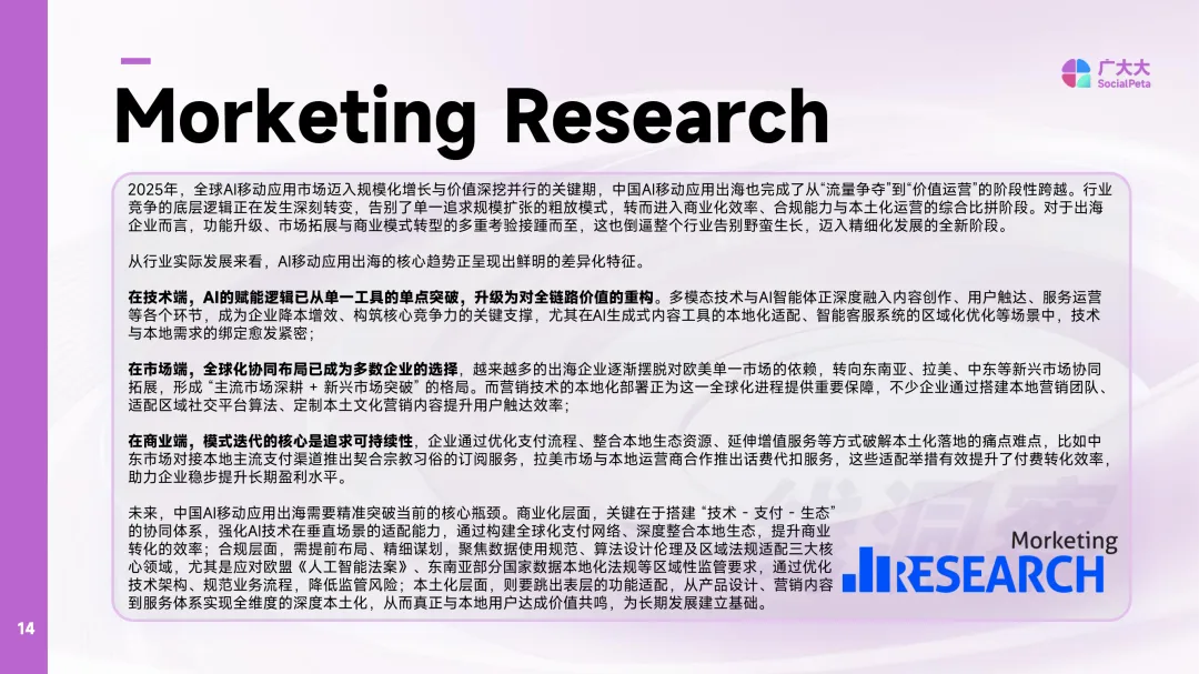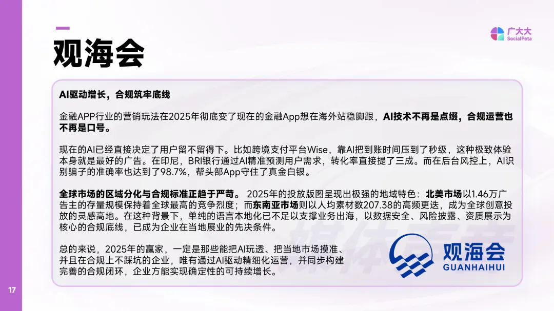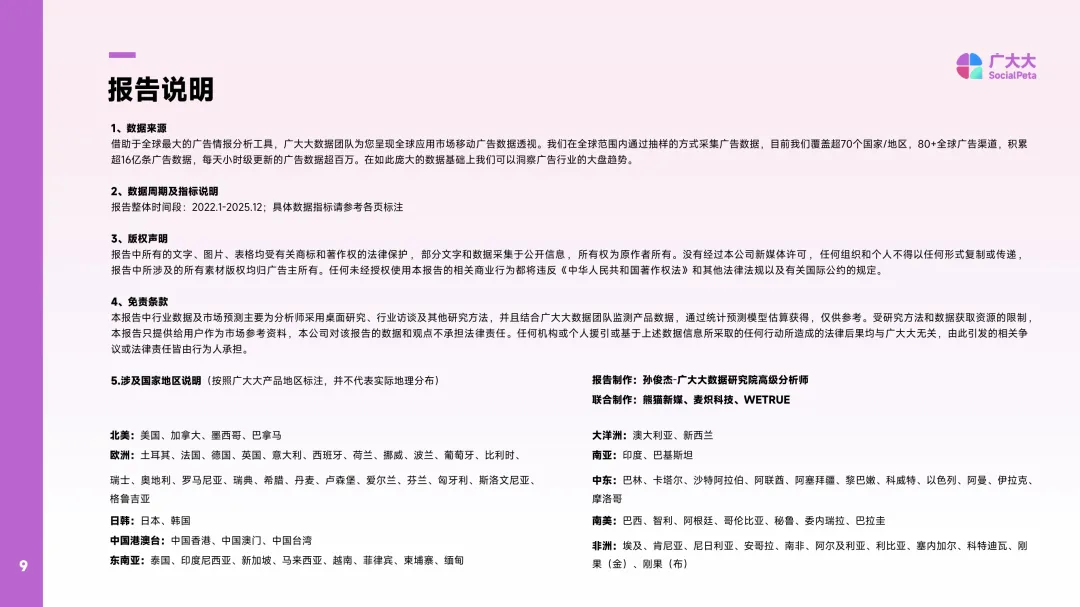 2025年移动应用营销白皮书(非游戏)聚焦全球移动应用市场在营销领域的整体趋势与结构特征。报告基于超过16亿条广告数据,覆盖70多个国家和地区,涵盖80多个广告渠道,提供实时更新的市场洞察。数据采集周期为2022年1月至2025年12月,具体指标以各页标注为准。报告强调数据来源的权威性,依托全球领先的广告情报分析工具,确保数据的全面性和时效性。同时明确指出,所有内容受版权保护,未经授权不得复制或传播。报告中的行业数据和预测仅作为市场参考,不承担法律责任,任何基于数据的行为后果由使用者自行承担。报告所涉及的地区划分依据产品标注,可能与实际地理分布存在差异。内容由广大大数据研究院高级分析师孙俊杰牵头制作,联合熊猫新媒、麦炽科技、WETRUE等机构共同完成。地区分类包括北美、欧洲、南亚、中东、日韩、南美、中国港澳台、非洲及东南亚等多个区域,展现全球市场的多样性与复杂性。