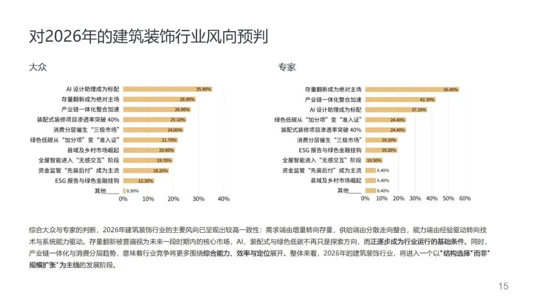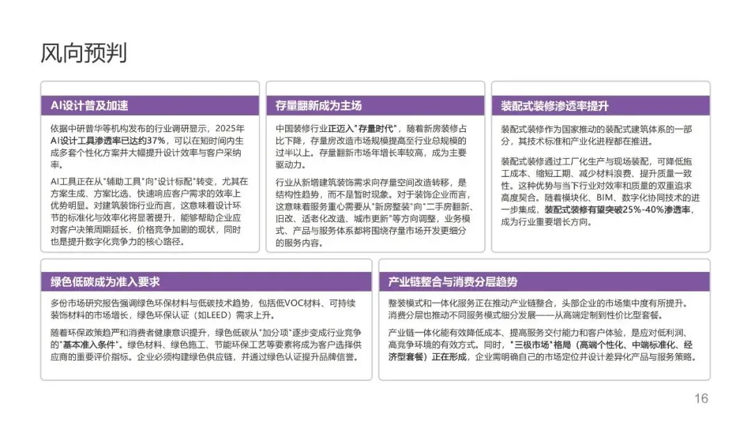 ,并提炼出存量翻新成为绝对主场、AI设计助理成标配、产业链一体化加速整合、绿色低碳成准入证、装配式装修渗透率提升等核心风向。