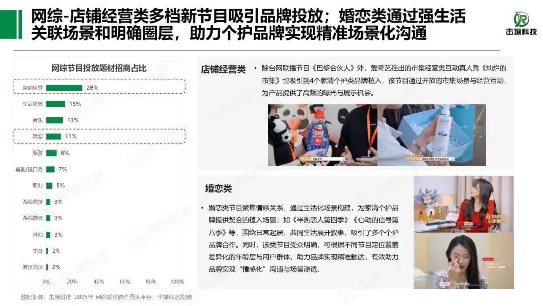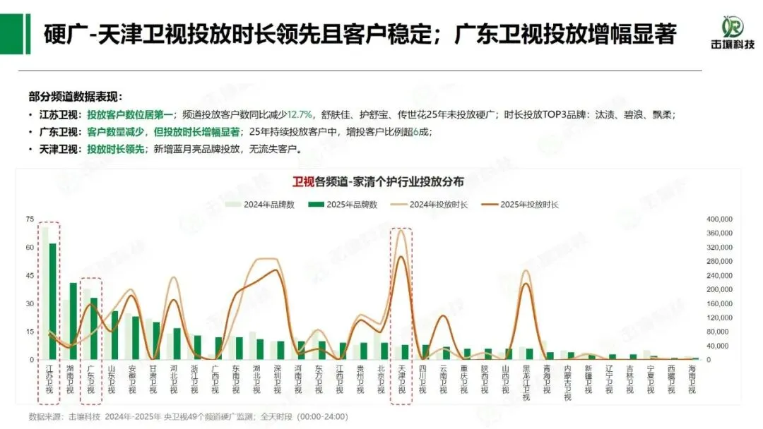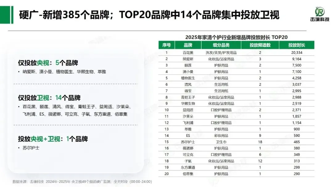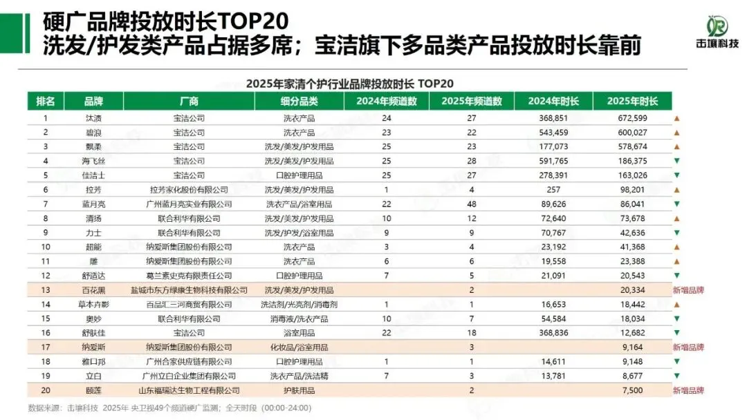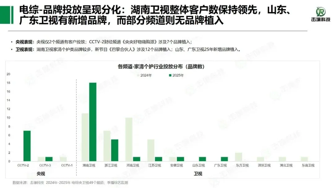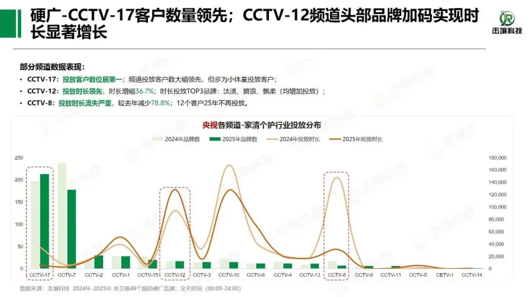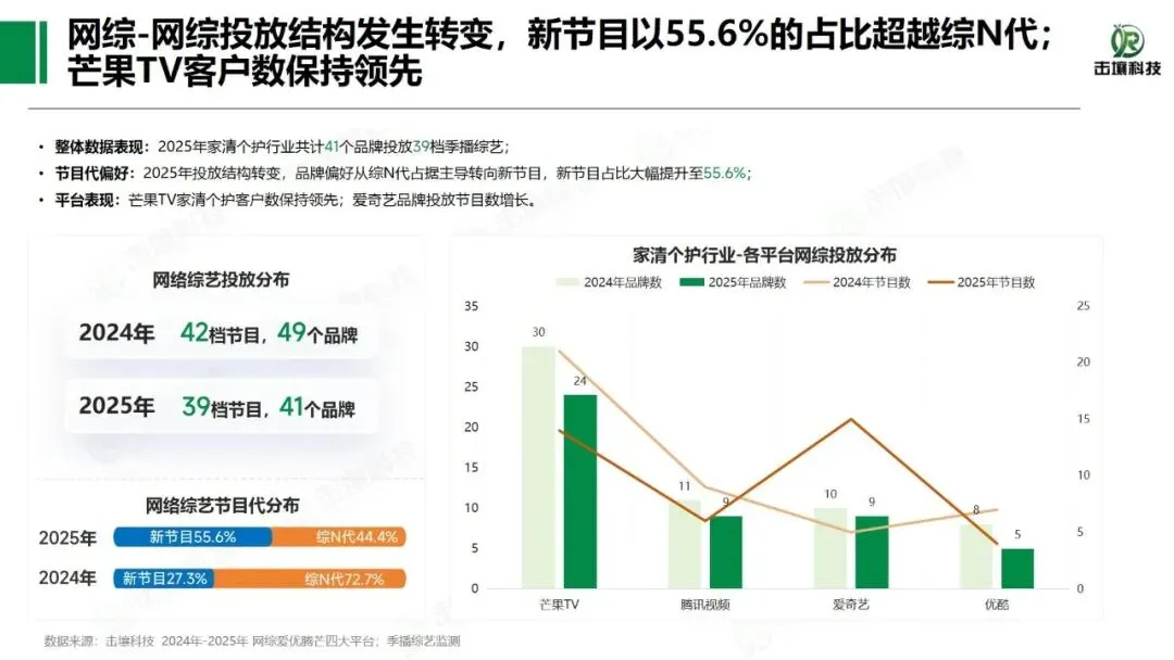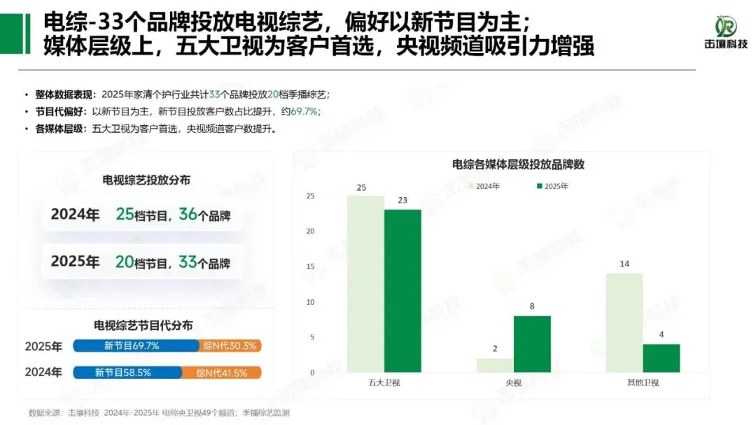 2025年家清个护行业广告投放格局呈现显著调整,电视硬广、综艺、网剧三大渠道均出现投放策略与资源选择的结构性变化。电视硬广端,品牌数与投放时长双降,晚黄时段降幅尤为明显,投放资源高度集中于其他卫视,央视与头部卫视呈现差异化投放特征,品牌新增与流失规模显著,宝洁系品牌占据投放时长前列。综艺领域,电综与网综均展现出新节目偏好,店铺经营类题材成为招商热门,五大卫视是电综核心阵地,芒果TV则领跑网综客户数,护肤品类在综艺投放中流动性突出。网剧投放虽品牌数略有下滑,但优酷平台优势凸显,客户高度聚焦平台自招商权益,标版、创可贴等资源使用量增长,洗发/护发、护肤品类成为投放主力,品类流动性较强。整体来看,行业投放更注重场景契合度与精准触达,各渠道品牌流向呈现跨平台迁移特征,头部品牌投放集中度与新锐品牌布局力度均有所提升。