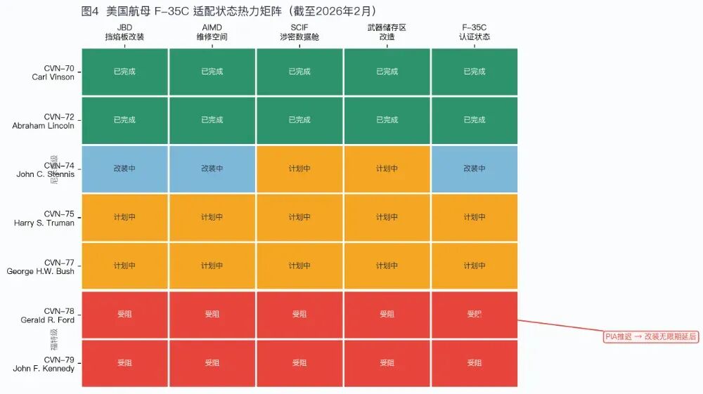 F-35C 的舰载兼容性改装全部积压在下一个 PIA 窗口,而超长部署正在推迟这个窗口;