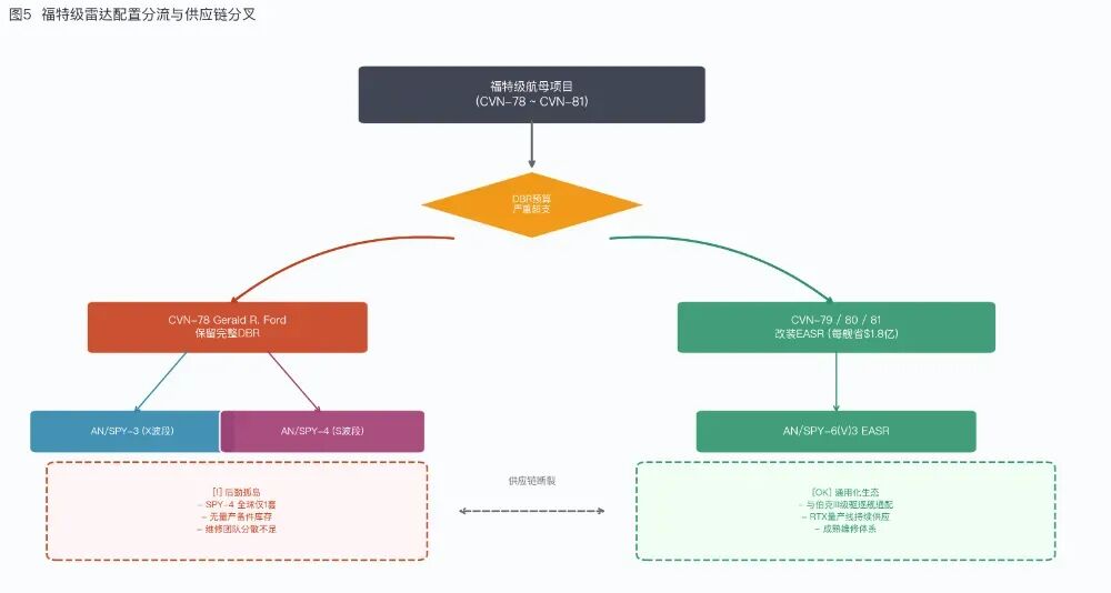 DBR 雷达的供应链孤立使福特号成为全球唯一依赖 SPY-4 的作战平台,后续舰已转向 EASR ;