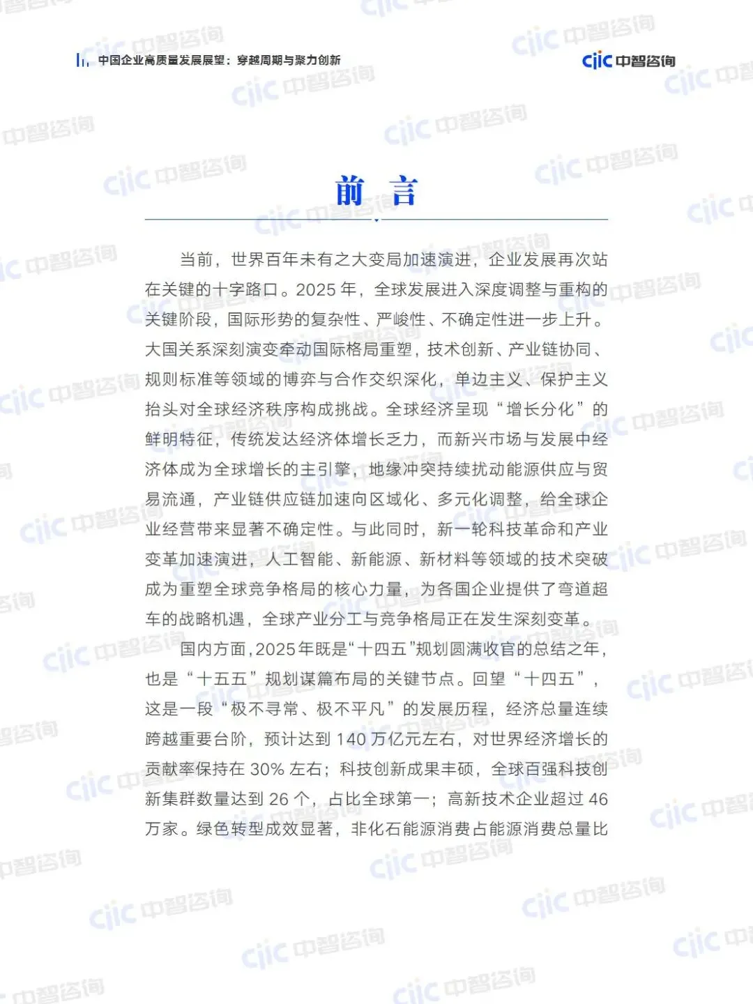 当前世界百年未有之大变局加速演进,全球经济增长分化、产业链重构,新一轮科技革命与产业变革成为重塑竞争格局的核心力量。2025年作为“十四五”规划收官、“十五五”规划谋篇布局的关键节点,中国经济展现出强劲发展韧性,企业高质量发展迈入从“重规模”到“重质效”的转型新阶段。在此背景下,中国企业改革与发展研究会联合中智管理咨询有限公司研究院,依托权威数据源,系统梳理“十四五”期间中国企业穿越周期的改革实践,分析2025年企业发展新动能,前瞻“十五五”改革发展核心方向,编制本报告。报告从宏观环境、“十四五”发展实践、2025年新动能锻造、“十五五”发展展望四大维度,剖析中国企业在政策、产业、科创、绿色转型、国际化等领域的突破与路径,为政府决策、企业战略制定提供数据支撑与实践参考。