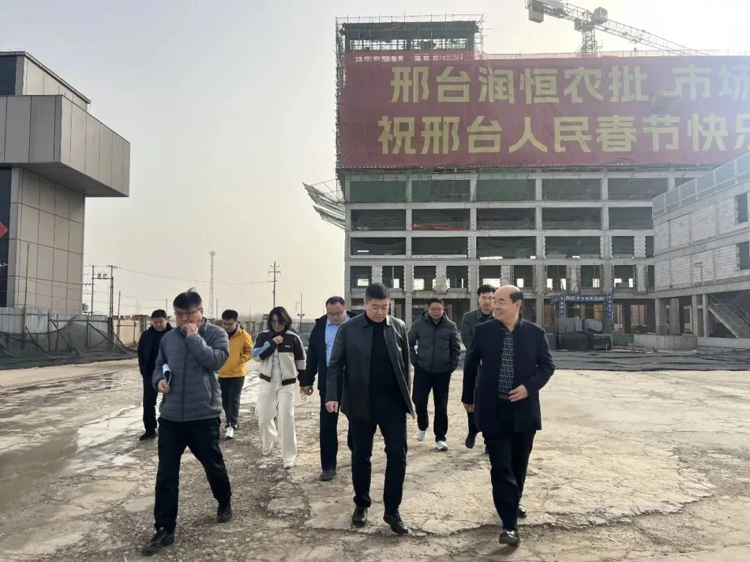 2 月 22 日上午,邢台市襄都区人民政府常务副区长赵巍,区发改局、科工局、火炬办主任等主要负责同志莅临邢台润恒综合农副产品批发市场,对 B3、B4 省重点项目建设情况进行现场调研。邢台润恒综合农副产品批发市场总经理刘海平带领相关负责人全程陪同调研。