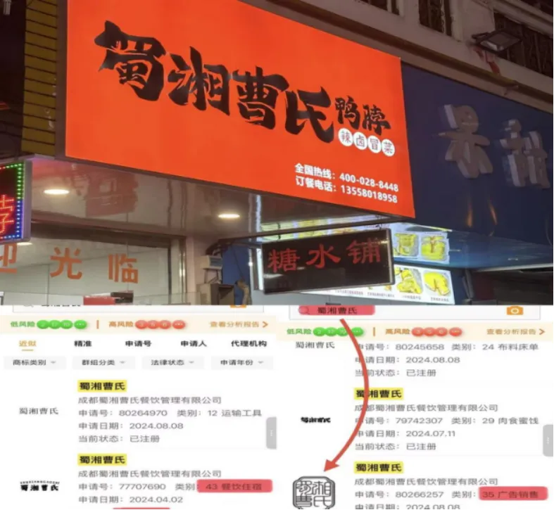 成都蜀湘曹氏餐饮管理有限公司的商标布局堪称行业典范,覆盖餐饮(第43 类)、广告(第35 类)、肉食(第29 类)等核心及延伸类别,形成 “餐饮为核心,多领域延伸” 的注册体系。