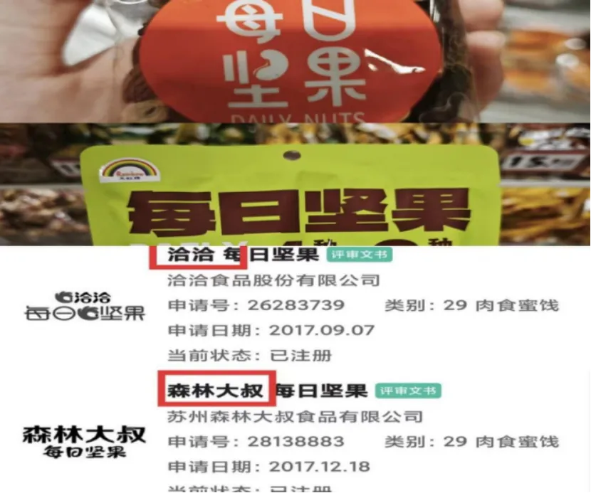“每日坚果” 因缺乏独特性,无法单独在加工坚果所属的 第29 类注册。目前市场上的合规玩法是 “品牌名 + 每日坚果”,如 “沃隆每日坚果”或在 2911 组群(加工坚果)进行注册。