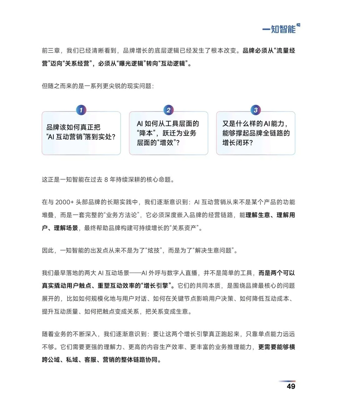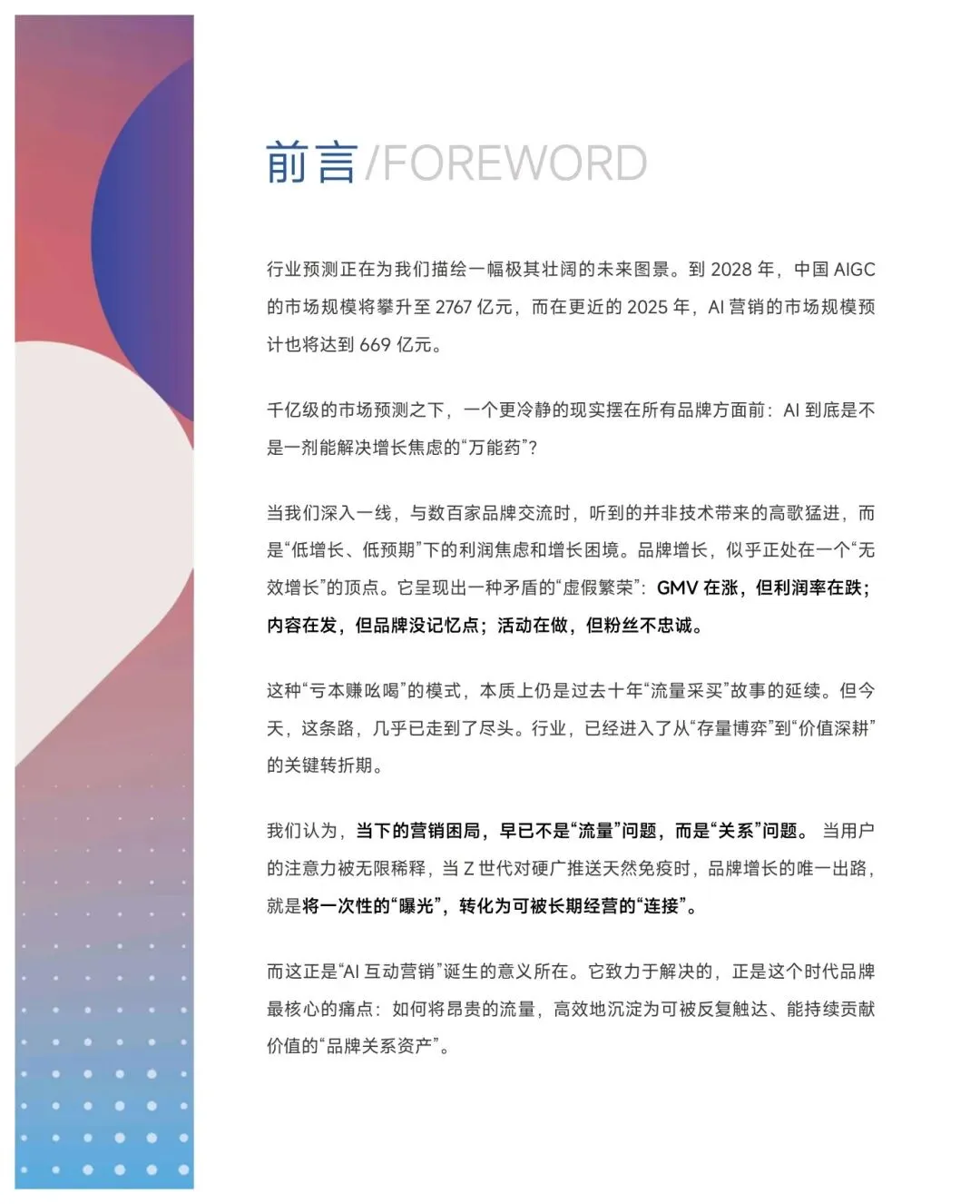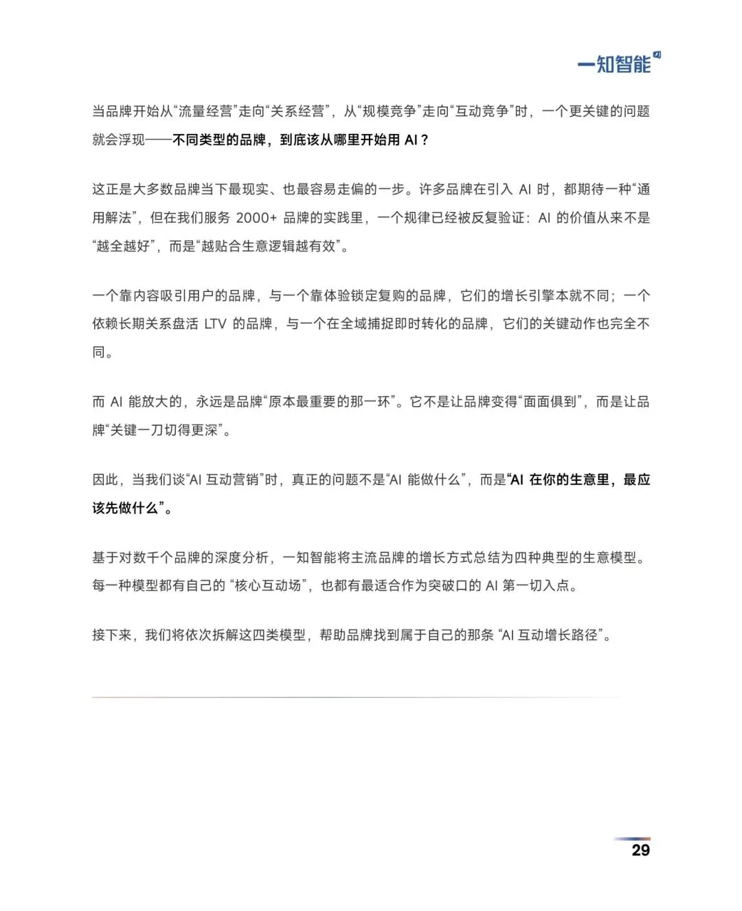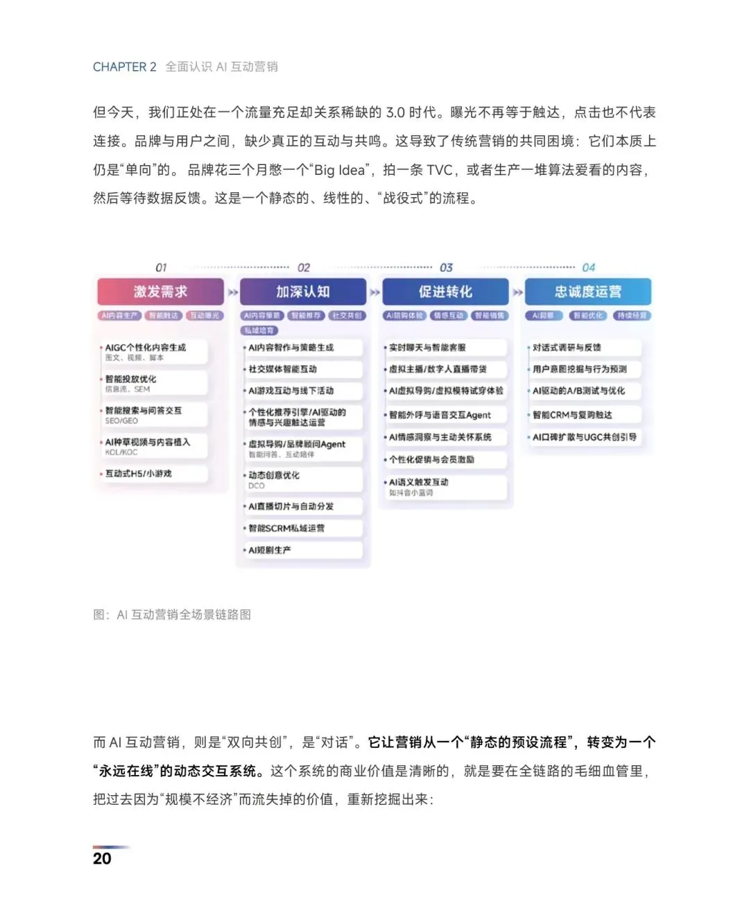 [?]报告聚焦:深度拆解AI互动营销的体系架构、落地方法与行业趋势,为不同类型品牌提供了从流量经营转向关系经营的AI增长全路径
