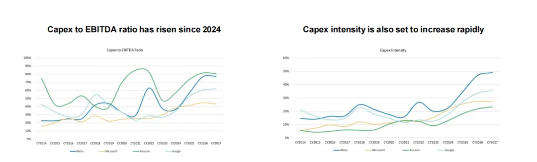 周期能否延续的核心,并非资本开支的绝对增速,而是投入是否具备自我造血能力。我们的行业模型测算显示,2026-2027 年全球科技行业经营现金流(OCF)与资本开支(capex)将持续维持匹配状态: