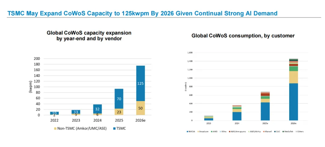 2025 年 Blackwell 芯片封装出货量达 551.95 万颗,而同期整机交付量仅 346.36 万台,中间形成 219.8 万颗的库存堆积;2026 年 Blackwell 芯片封装出货量预计为 549.13 万颗,而整机交付量预计提升至 570.71 万台,将逐步消化 2025 年的库存堆积;整机机柜的交付规模,将从 2025 年的 26936 架,大幅提升至 2026 年的 60910 架,2027 年进一步增长至 82624 架。这一数据清晰表明,上游能生产、能封装芯片,不等于下游能顺利完成整机交付并实现算力落地。产业链的利润池,正在从芯片设计、封装环节,向具备整机系统集成、交付能力的服务器 ODM、数据中心基建厂商转移,交付能力就是定价权。3.2 先进封装:仍是核心瓶颈,利用率替代产能成为估值核心变量先进封装(CoWoS/2.5D 封装)仍是算力产业链的核心码头,但其定价逻辑正在发生关键变化:2026 年之前,市场关注的核心是产能扩张;2026 年起,产能利用率的边际变化,将成为决定板块估值弹性的核心。从行业数据来看,先进封装行业的增长确定性极强:CoWoS/2.5D 封装行业收入,已从 2021 年的 4.48 亿美元,增长至 2026 年预计的 139.1 亿美元,5 年复合增速超 100%。产能方面,行业 CoWoS 季度产能将从 2025 年 Q1 的 45kwpm,提升至 2026 年 Q4 的 150kwpm,产能扩张是市场已充分定价的明牌。而利用率的波动,才是供需格局变化的边际信号:2025 年 Q4 行业 CoWoS 利用率为 77%,2026 年 Q1 预计回升至 80%,Q2-Q3 受季节性因素影响小幅回落至 76%-77%,Q4 预计大幅回升至 93%。我们判断,2026 年下半年利用率的回升,将成为板块估值修复的核心催化剂;而若出现 “产能扩张超预期 + 利用率持续下滑” 的组合,板块将面临估值回调压力。3.3 HBM:单机容量持续跃升,成本占比抬升驱动话语权转移