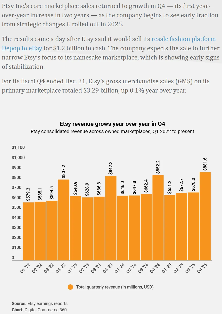 AMZDH获悉,近日,手工电商领先平台Etsy发布了截至2025年12月31日的第四季度及2025财年全年财报。报告显示,Etsy全年营收实现小幅增长,但对Depop业务的出售决定及对未来核心平台的聚焦,标志着其战略进入新阶段。