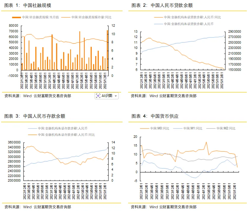 2 月 13 日,中国人民银行公布 1 月金融统计数据。初步统计,2026 年 1 月末社会融资规模存量为 449.11 万亿元,同比增长 8.2%。1 月份社会融资规模增量为 7.22 万亿元,比上年同期多 1662 亿元。1 月末,广义货币(M2)余额 347.19 万亿元,同比增长 9%。狭义货币(M1)余额 117.97 万亿元,同比增长 4.9%。流通中货币(M0)余额 14.61 万亿元,同比增长 2.7%。1 月份净投放现金 5191 亿元。1 月末,本外币存款余额 344.46 万亿元,同比增长 10.1%。月末人民币存款余额 336.77 万亿元,同比增长 9.9%。1 月末,本外币贷款余额 280.59 万亿元,同比增长 6%。月末人民币贷款余额 276.62 万亿元,同比增长6.1%。年初金融数据表现亮眼,释放出货币政策精准发力、环境适度宽松的积极信号,为全年经济平稳起步筑牢基础。从结构来看,政府债与企业债融资规模同比明显扩大,反映出财政政策与信用环境形成有效联动,有利于基建投资、制造业升级以及新质生产力相关领域持续获得资金支持。市场普遍认为,当前整体流动性保持合理充裕,市场利率中枢下移预期进一步强化,对股票、债券市场以及成长风格资产均构成正面支撑。
