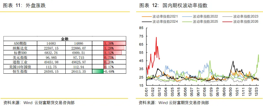 节前国内期权市场隐含波动率在高位波动,多数品种并未因为过节预期而大幅上升,整体情绪平稳,股指、多数商品期权均未定价大幅波动预期,仅小幅上升,幅度可控。假期外盘整体平稳,白银、铂、钯、原油出现阶段性异动,成为节后波动核心变量。但白银、原油波动率已处高位,即便假期波动显著,节后进一步持续上行空间有限,若出现大幅高开与剧烈震荡,应以控制风险为主。节后国内股指相对偏乐观,主要因为限制美国总统行政权力的预期存在,将缓解市场对贸易保护过度升级的担忧,叠加访华预期,中美关系阶段性向好概率提升,但也要注意波动提升的风险。