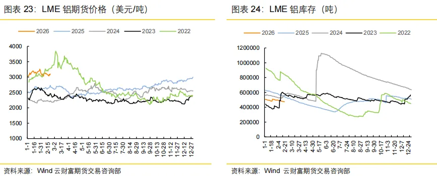 春节假期期间,LME 铝价小幅走弱后持续回升,收盘价较节前走高。截至 2 月 22 日,LME 铝 3M 价格为 3105.5 美元/吨,与假期前价格(2 月 13 日收盘 15:00)相比上涨 1.40%。