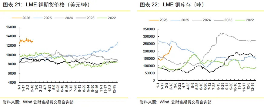 春节假期期间,LME 铜价震荡运行,收盘价较节前小幅走高。截至 2 月 22 日,LME铜 3M 价格为 13000 美元/吨,与假期前价格(2 月 13 日收盘 15:00)相比上涨 0.82%。