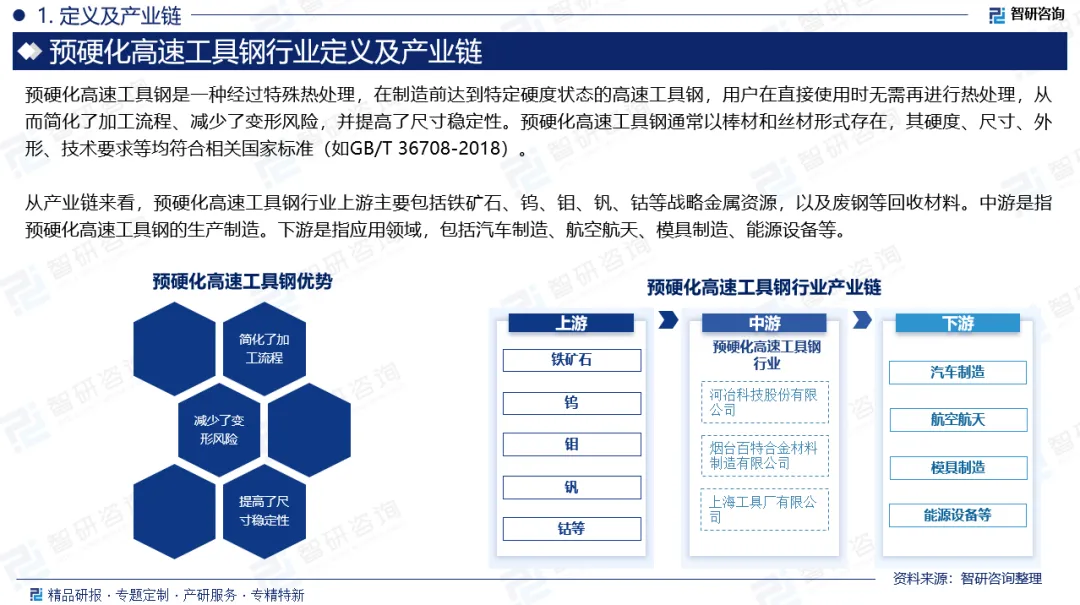 产业链:从产业链来看,预硬化高速工具钢行业上游主要包括铁矿石、钨、钼、钒、钴等战略金属资源,以及废钢等回收材料。中游是指预硬化高速工具钢的生产制造。下游是指应用领域,包括汽车制造、航空航天、模具制造、能源设备等。
