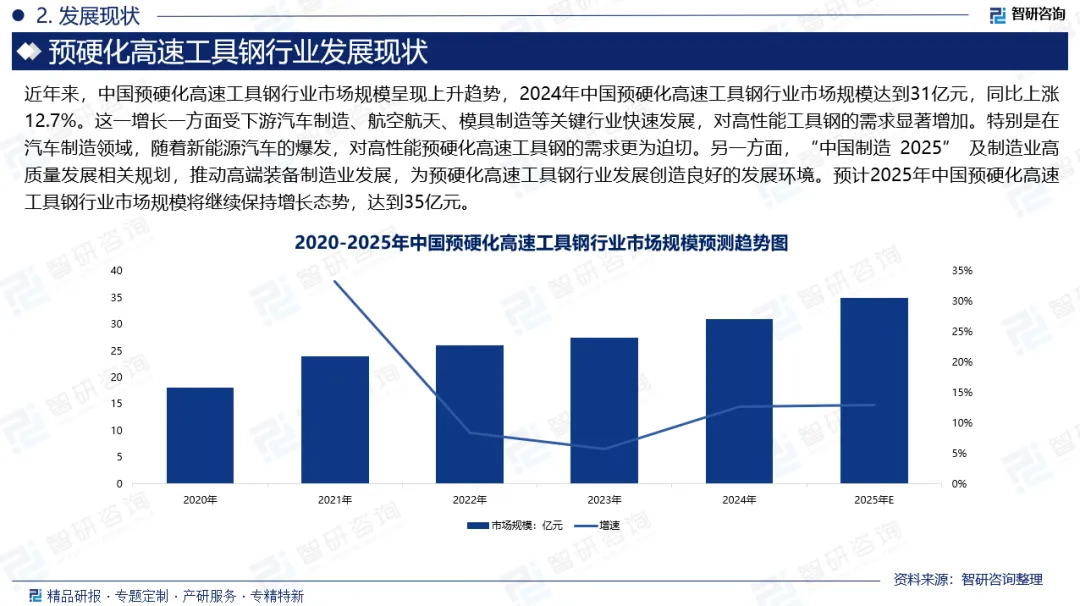 预硬化高速工具钢是一种经过特殊热处理,在制造前达到特定硬度状态的高速工具钢,用户在直接使用时无需再进行热处理,从而简化了加工流程、减少了变形风险,并提高了尺寸稳定性。近年来,中国预硬化高速工具钢行业市场规模呈现上升趋势,2024年中国预硬化高速工具钢行业市场规模达到31亿元,同比上涨12.7%。这一增长一方面受下游汽车制造、航空航天、模具制造等关键行业快速发展,对高性能工具钢的需求显著增加。特别是在汽车制造领域,随着新能源汽车的爆发,对高性能预硬化高速工具钢的需求更为迫切。另一方面,“中国制造 2025” 及制造业高质量发展相关规划,推动高端装备制造业发展,为预硬化高速工具钢行业发展创造良好的发展环境。预计2025年中国预硬化高速工具钢行业市场规模将继续保持增长态势,达到35亿元。