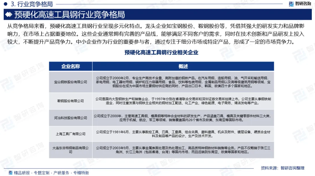 企业格局:从竞争格局来看,预硬化高速工具钢行业呈现多元化特点。龙头企业如宝钢股份、鞍钢股份等,凭借其强大的研发实力和品牌影响力,在市场上占据重要地位。这些企业通常拥有完善的产品线,能够满足不同客户的需求,同时在技术创新和产品研发上投入较大,不断提升产品竞争力。中小企业作为行业的重要参与者,通过专注于细分市场或特定产品,形成了一定的市场竞争力。