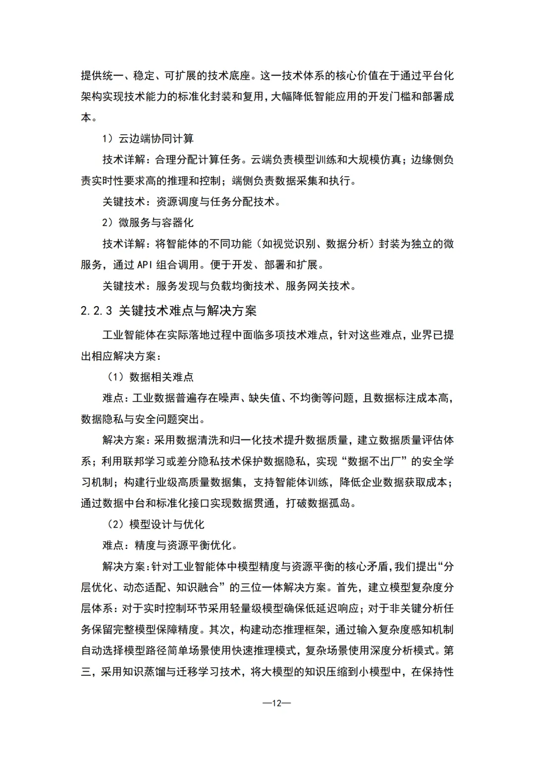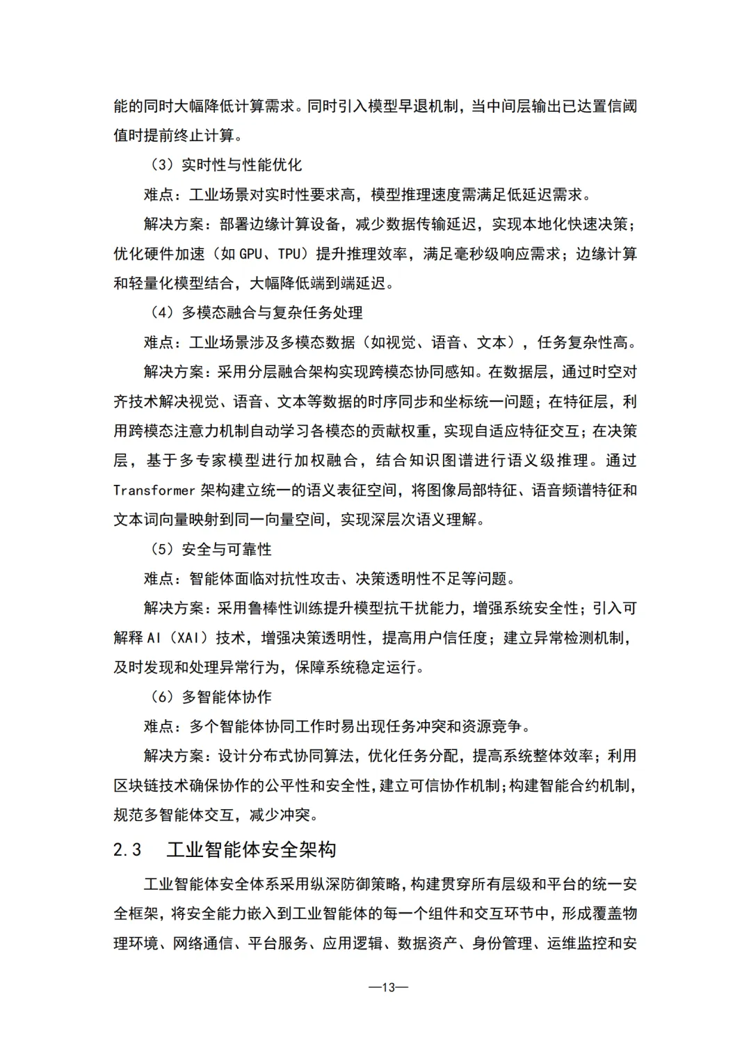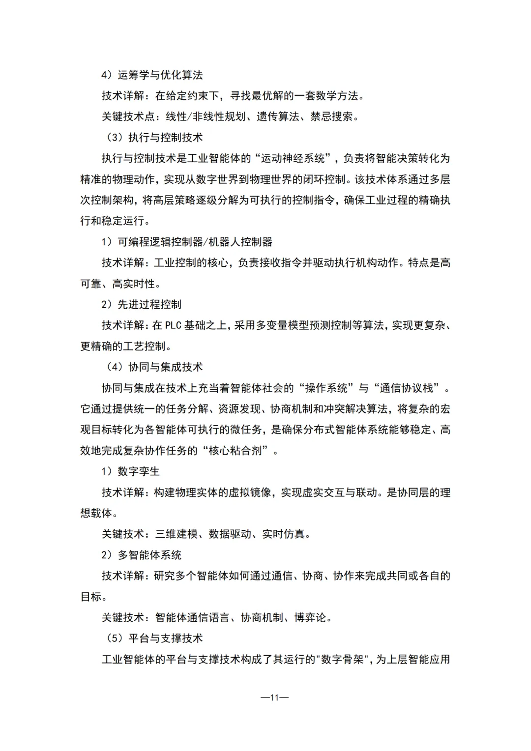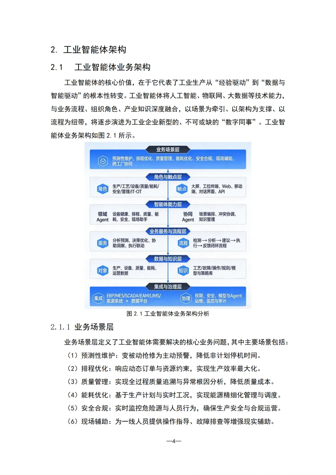 架构设计:创新性构建了业务架构、技术架构与安全架构三位一体的工业智能体体系,涵盖感知连接、认知决策、执行控制、协同集成等关键技术;