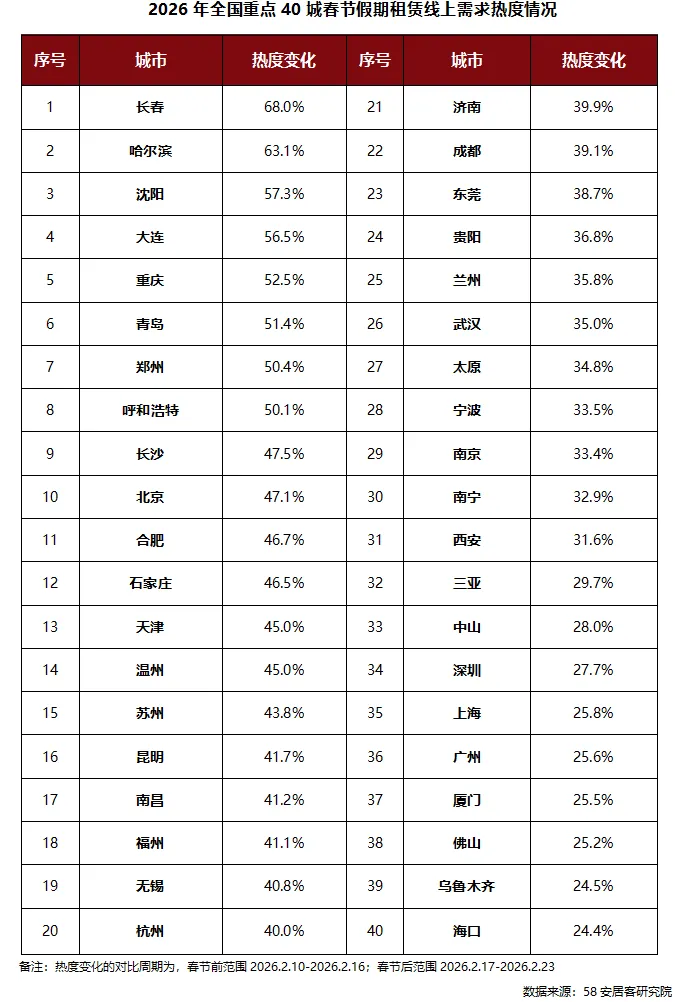根据58安居客全国40城租赁市场监测数据显示,今年春节期间,全国40城整体租赁线上需求热度较节前上升42%,40城租赁热度均呈正向增长,8个城市热度涨幅超过50%。预计节后租赁市场将进入“小阳春”旺季复苏通道,需求端的集中释放将推动市场热度抬升。