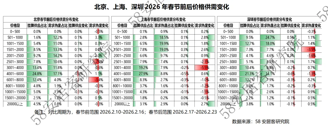 整体来看,501-2000元/月的中低价位房源春节假期期间线上需求热度普遍回升,显示出租客对性价比的偏好;而3000元/月以上的中高端房源,尤其是6000元/月以上的高价房源,需求热度普遍下滑,市场结构向刚需倾斜。