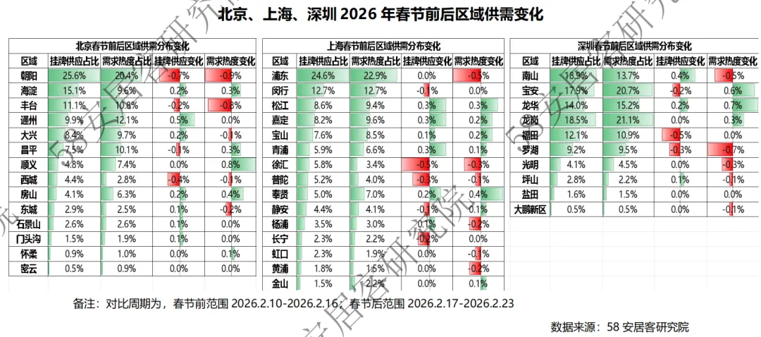 结合各城市区域供需分布变化来看,三大城市核心城区普遍出现供需转弱现象,受返乡返工节奏影响显著。近郊/远郊呈现出需求热度回升、供应结构稳定,体现租客向低成本、高通勤区域外迁的趋势。北京的朝阳和丰台线上需求热度占比下降0.9%、0.8%,而顺义的需求热度占比上升0.8%。上海的浦东和徐汇线上需求热度占比下降0.5%、0.3%,而奉贤的需求热度上升0.4%。深圳的宝安、龙华和龙岗的线上需求热度占比上升1.6%,而南山、罗湖等区域需求热度占比下降0.5%、0.7%。