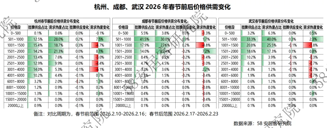 重点二线城市价格需求表现差异较大,杭州501-1000元/月/套及1501-2000元/月/套的线上需求热度占比较节前显著上升7.5%、8.1%;而2001-4000元/月/套的线上需求热度占比共下降13.5%。成都1501-2000元/月/套的线上需求热度占比较节前显著上升7.2%,而1001-1500元/月/套的线上需求热度占比下降4.8%。武汉租赁市场价格表现相对较弱,1000 元/月/套以下的需求热度上升2.8%。整体来看,重点二线城市市场以刚需主导,501-2000元/月的中低价位房源节后需求普遍回升,租客对性价比的偏好显著。