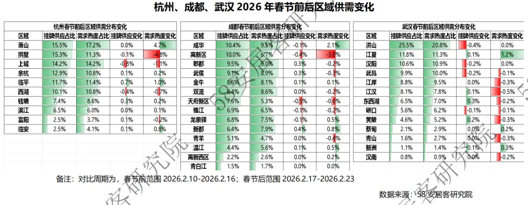 结合区域供需变化来看,杭州萧山的需求热度占比上涨4.7%,而拱墅、上城需求热度占比分别下降4.8%、1.1%;核心区需求下滑明显,职住平衡特征突出。成都的成华、新都需求热度占比上涨2.1%、0.8%,而高新区需求热度占比下降3%;刚需需求向1501-2000元/月的价格段集中,近郊需求韧性更强,市场结构更趋均衡。武汉的江夏需求热度上升1.2%,而东西湖、江岸及江汉的需求热度均小幅下降,体现出租客向低成本、高通勤效率区域外迁的趋势。