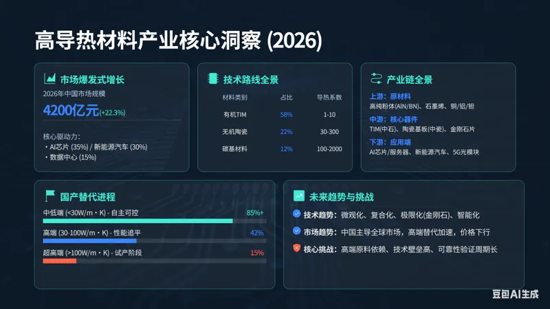 国产替代率:中低端85%,高端(≥50W/m·K)42%,2030 年目标70%。