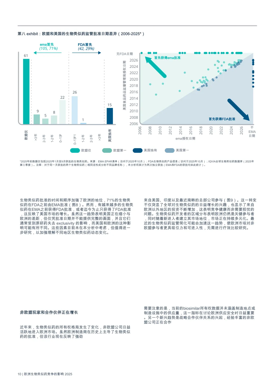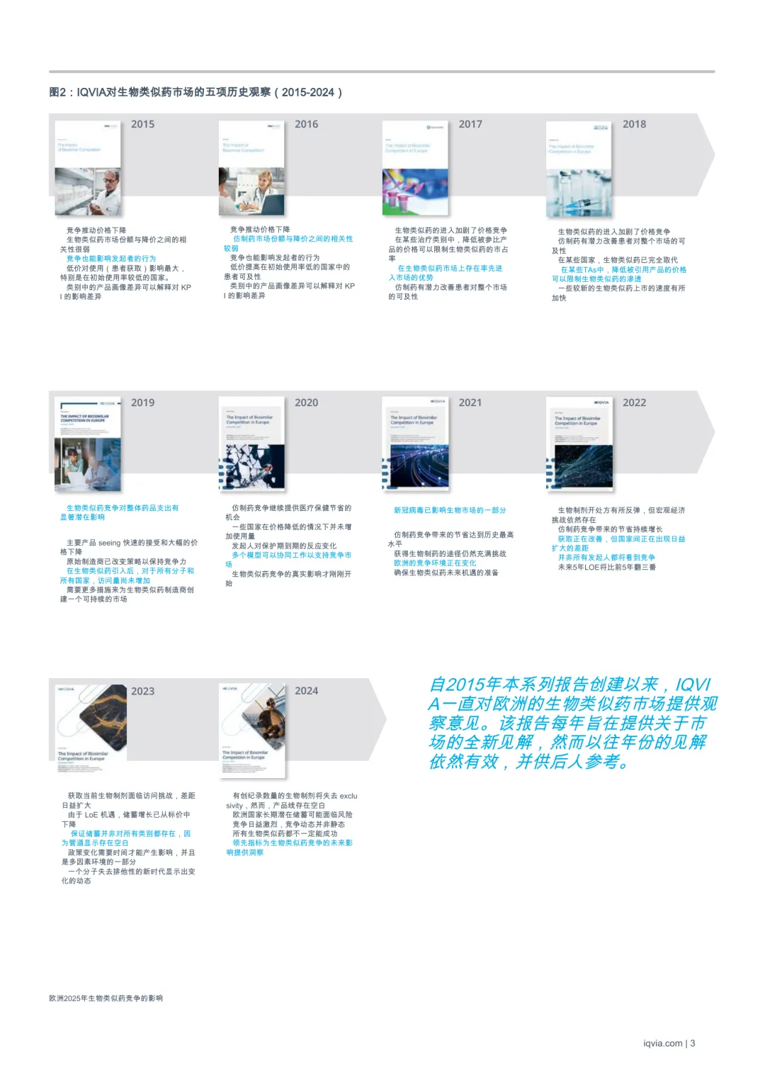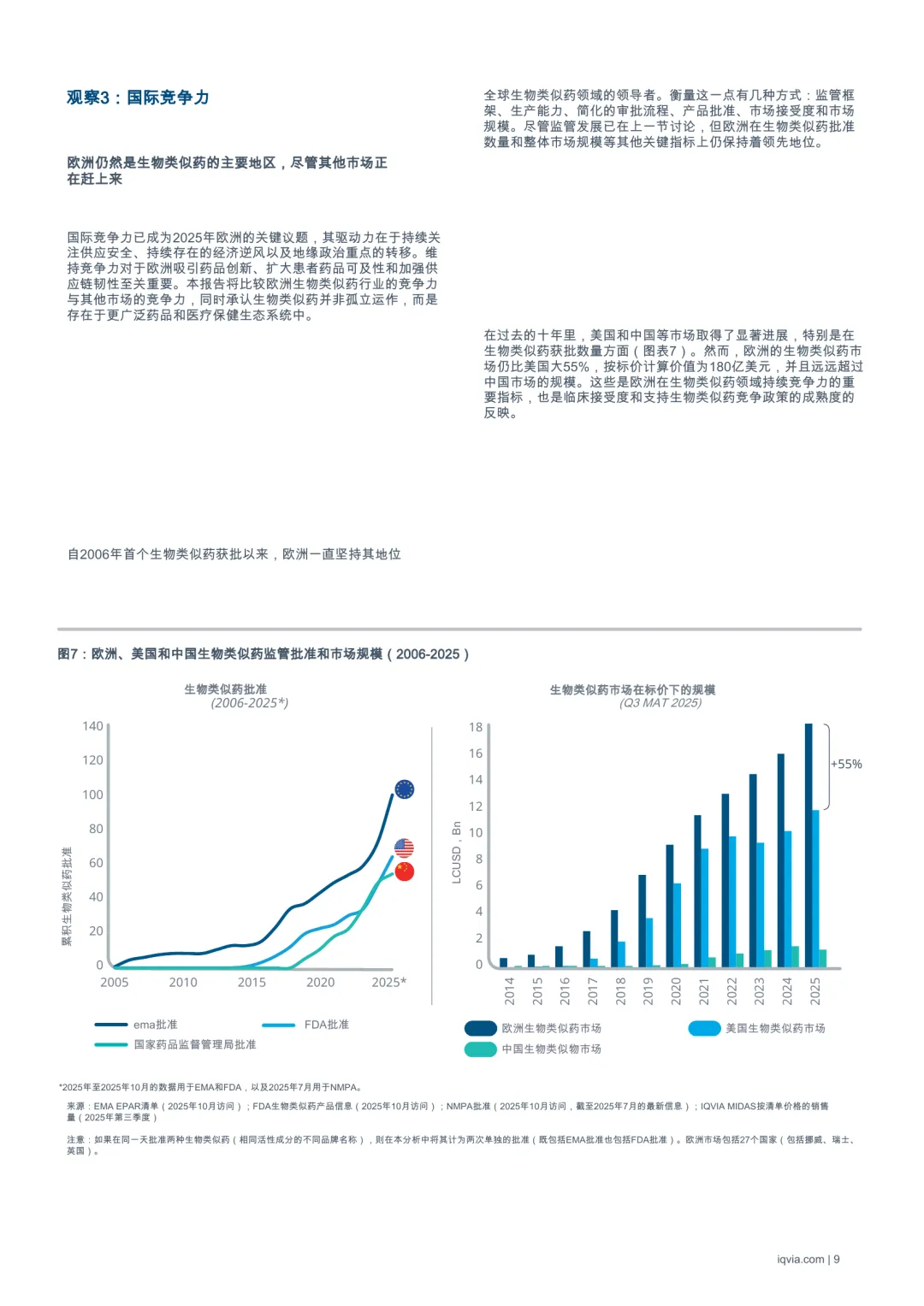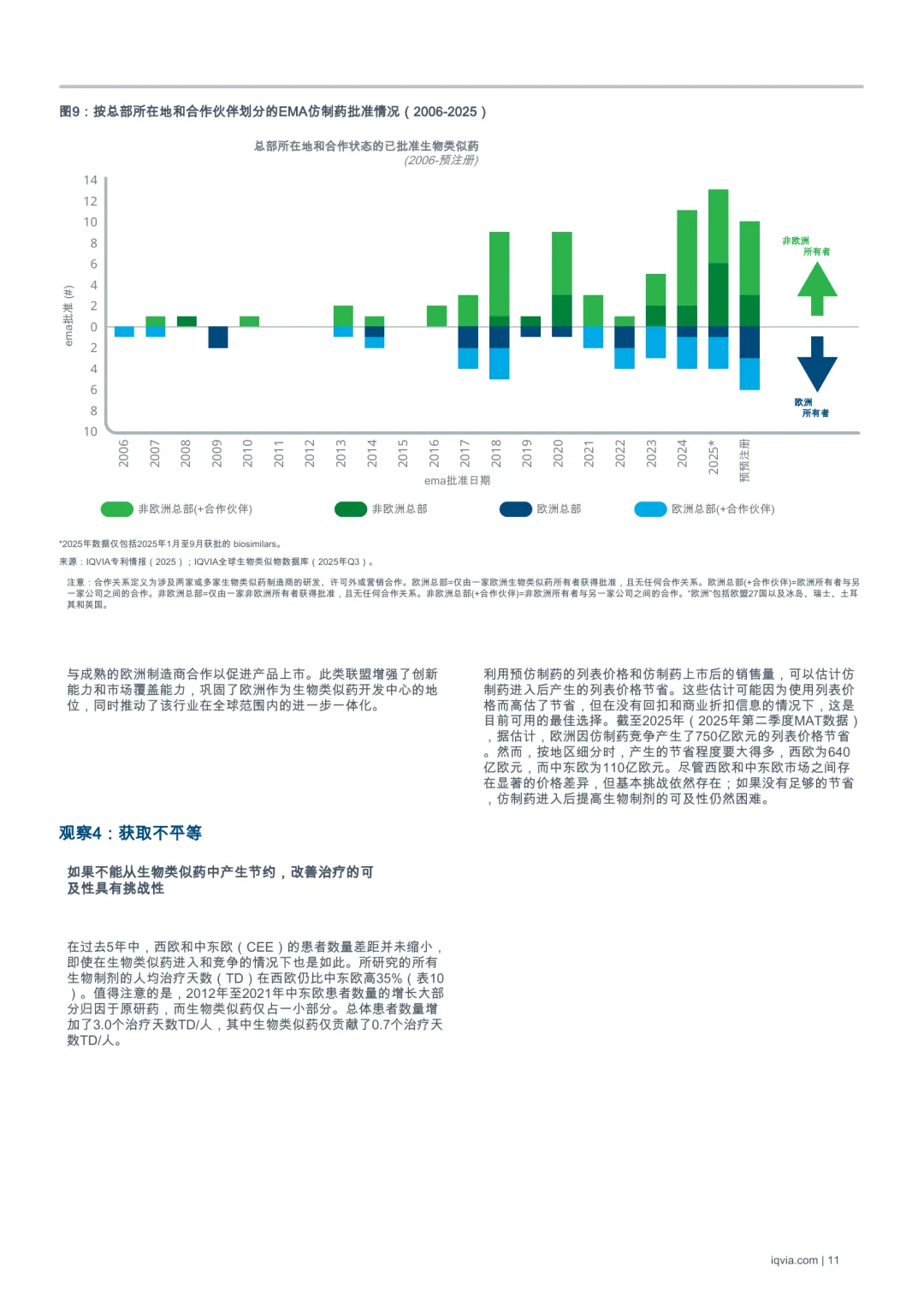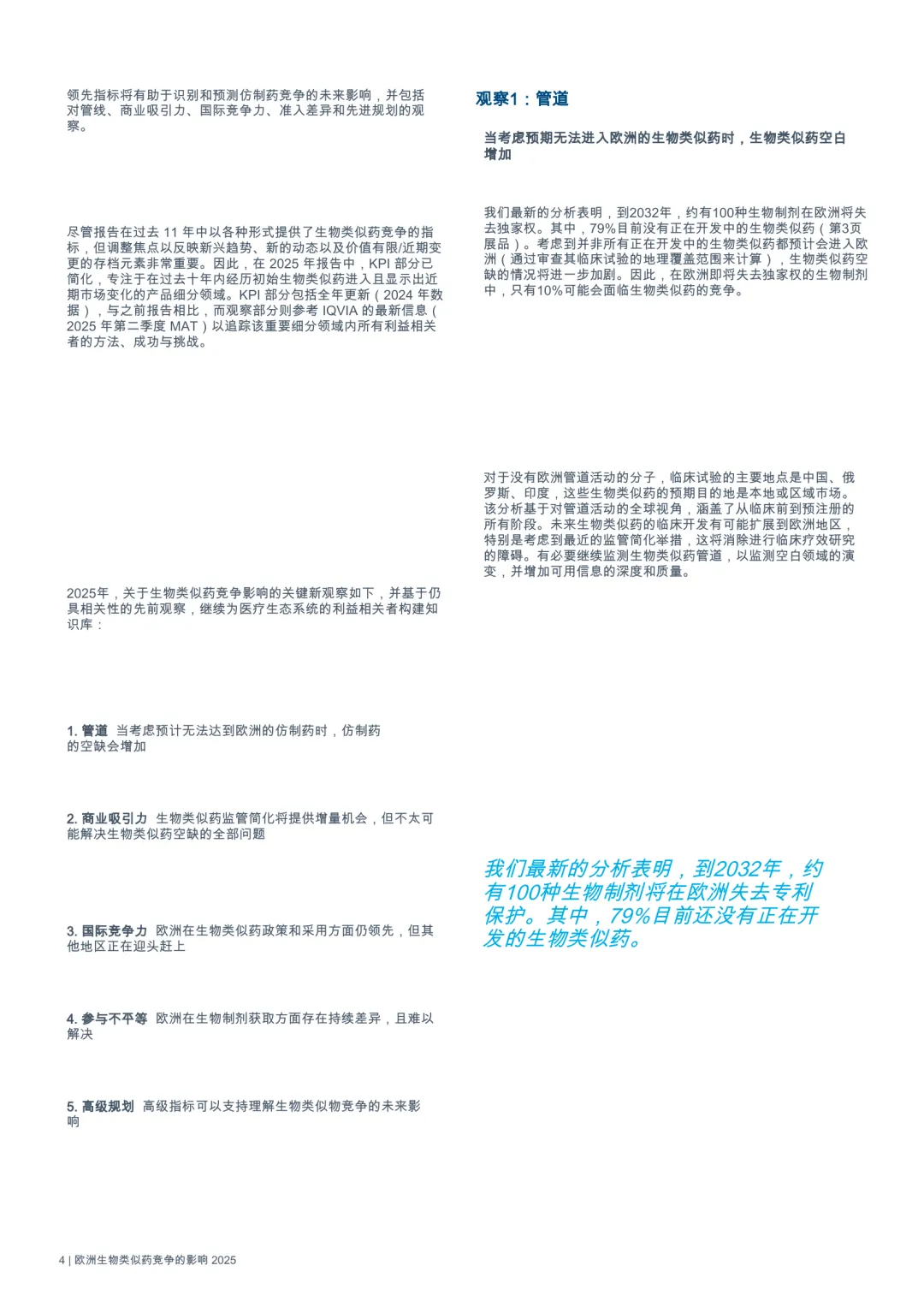 生物类似药在欧洲医疗体系中持续发挥关键作用,为支付方节省成本、为创新留出空间,并提升患者对生物治疗的可及性。自2006年首个生物类似药上市以来,该领域已成为有效医疗体系的重要组成部分。然而,当前的发展管道预示着未来可能面临的挑战,这些挑战与此前报告中提到的问题相似。报告基于对2025年市场状况的新观察,引入了一套简化的关键绩效指标(KPIs),用于评估生物类似药在23个欧洲市场中的影响。这些指标聚焦于过去十年内进入市场的生物类似药,特别是那些近期表现出显著市场变化的产品。KPIs描述了价格、销量和市场份额的变化,反映了竞争对市场结构的影响。生物制药在欧盟药品市场中占据重要地位,标价占比达44%。新型生物治疗法的持续推出、成熟品牌的增长以及生物制剂被广泛认可为先进治疗手段,推动了这一领域的长期增长。过去几年的观察显示,生物类似药的竞争不仅影响价格,也改变市场格局,尤其是在某些治疗类别中,低价策略可能限制生物类似药的市场渗透。随着市场逐渐成熟,生物类似药的增长率已趋近其他药品细分市场,表明其在欧洲市场中的地位日益稳固。尽管如此,获取不平等、市场竞争的不平衡以及政策环境的变化仍是需要关注的问题。报告还强调,生物类似药的可持续发展依赖于合理的定价机制、公平的市场准入以及有效的监管框架。