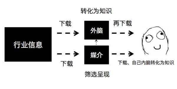 外脑:专家、咨询公司/券商等专业分析机构处理信息后转化为知识,我们再来下载。其中,外脑也会从外部媒介中获取一部分信息,纳入自己的知识体系。