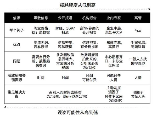 从左到右,行业信息经过层层转化,越到后边, 主观性越强,得到的越是“观点”而非“信息”。而因为你要交付的实际上也是研究后得到的“观点”,所以信源越靠右, 效率(投入-产出比)越高。