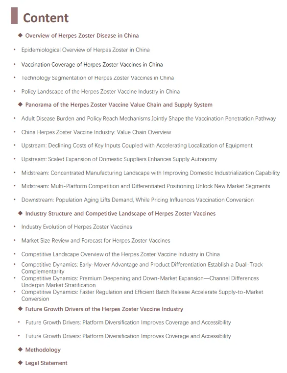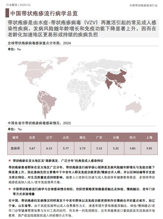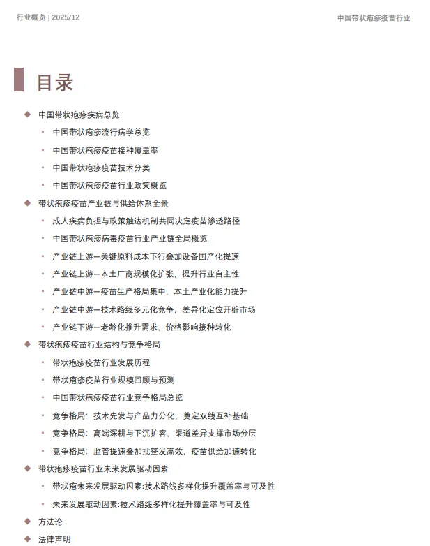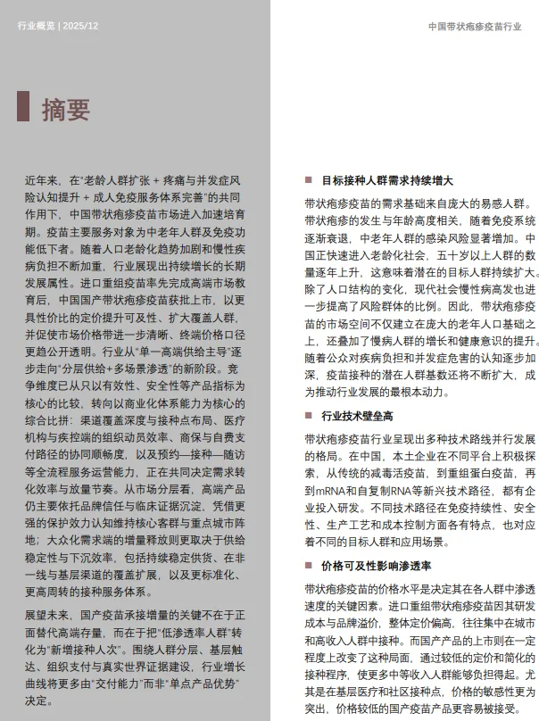 近年来,在“老龄人群扩张+疼痛与并发症风险认知提升+成人免疫服务体系完善”的共同作用下,中国带状疱疹疫苗市场进入加速培育期。疫苗主要服务对象为中老年人群及免疫功能低下者。随着人口老龄化趋势加剧和慢性疾病负担不断加重,行业展现出持续增长的长期发展属性。进口重组疫苗率先完成高端市场教育后,中国国产带状疱疹疫苗获批上市,以更具性价比的定价提升可及性、扩大覆盖人群,并促使市场价格带进一步清晰、终端价格口径更趋公开透明。行业从“单一高端供给主导”逐步走向“分层供给+多场景渗透”的新阶段。竞争维度已从只以有效性、安全性等产品指标为核心的比较,转向以商业化体系能力为核心的综合比拼:渠道覆盖深度与接种点布局、医疗机构与疾控端的组织动员效率、商保与自费支付路径的协同顺畅度,以及预约—接种—随访等全流程服务运营能力,正在共同决定需求转化效率与放量节奏。从市场分层看,高端产品仍主要依托品牌信任与临床证据沉淀,凭借更强的保护效力认知维持核心客群与重点城市阵地;大众化需求端的增量释放则更取决于供给稳定性与下沉效率,包括持续稳定供货、在非一线与基层渠道的覆盖扩展,以及更标准化、更高周转的接种服务体系。