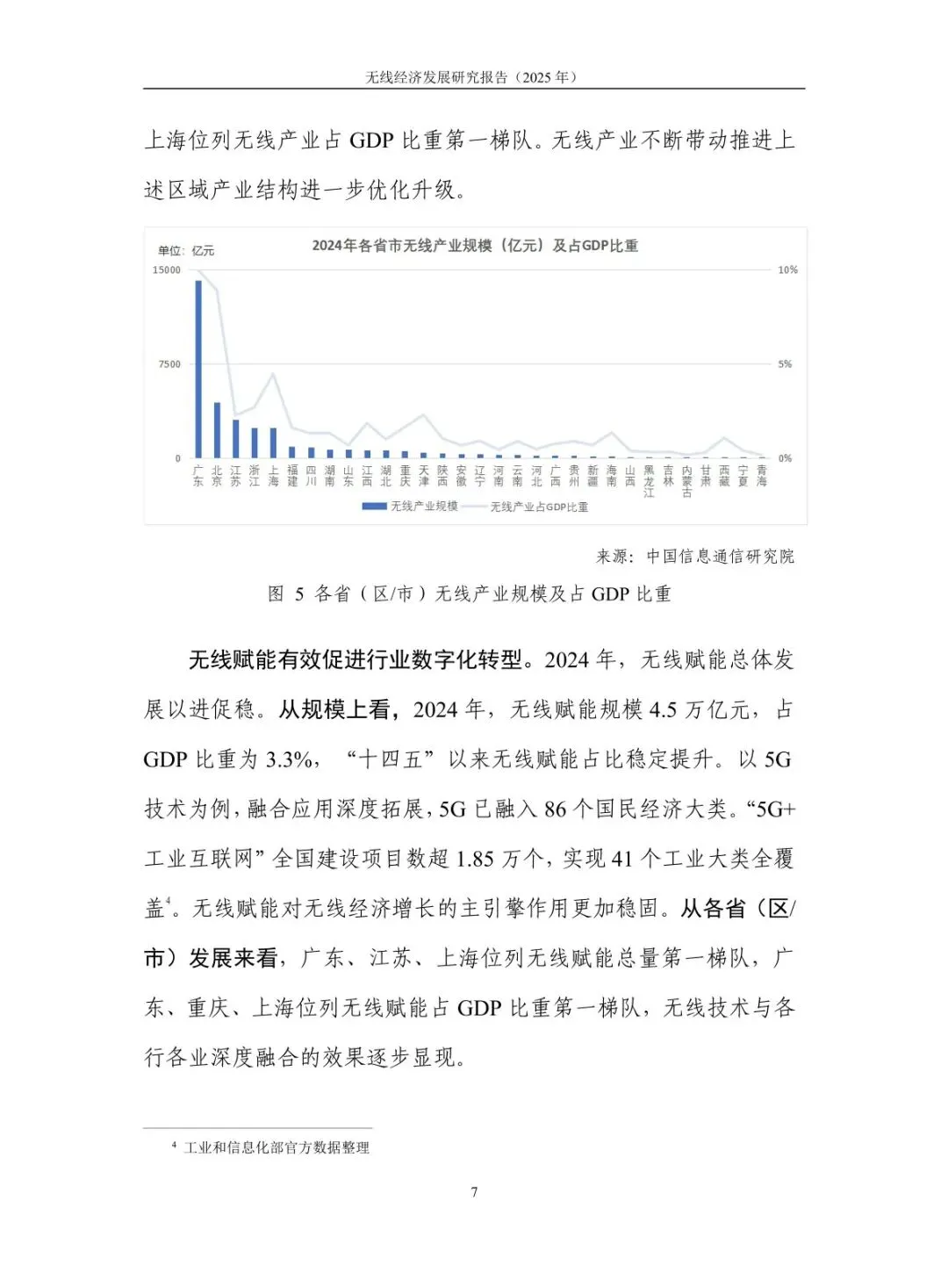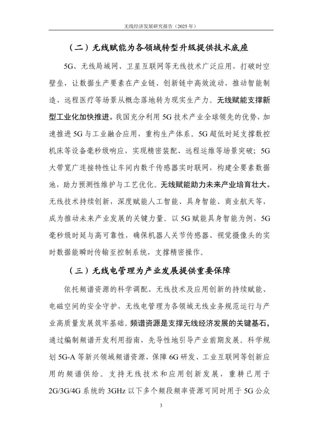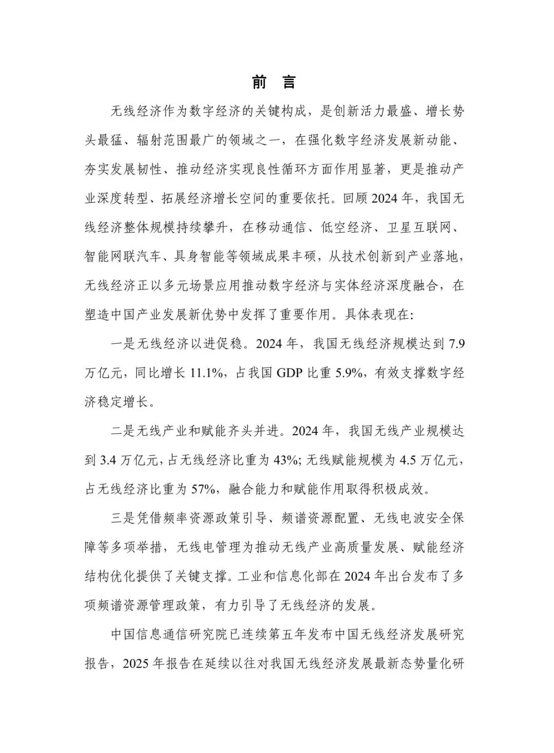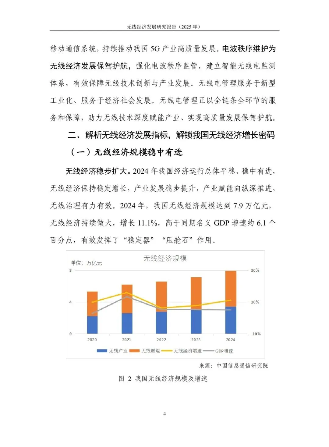 规模稳步增长,结构持续优化:2024 年无线经济规模达 7.9 万亿元,高于同期名义 GDP 增速 6.1 个百分点,占 GDP 比重从 “十四五” 初期的 5.3% 提升至 5.9%。无线产业占比 43%,电子信息制造业与服务业齐头并进,智能手机产量 12.5 亿台、移动物联网业务收入增长 13.3%;无线赋能占比 57%,5G 融入 86 个国民经济大类,“5G + 工业互联网” 项目超 1.85 万个,赋能各行业数字化转型。 核心技术突破,创新应用拓展:5G-A 实现全方位增强,330 余个城市启动部署,无源物联、通感一体等技术推动场景规模化;6G 技术攻关取得进展,“智简内生 6G 原型系统” 实现 6.6Gbps 传输速率,3GPP 启动标准化研究。低空经济市场规模预计 2025 年达 1.5 万亿元,政策与技术双轮驱动;商业航天加速发展,“千帆星座”“吉林一号” 等组网推进,手机直连卫星技术迈入大众消费市场。 基础设施超前,覆盖持续完善:截至 2025 年 7 月末,5G 基站达 459.8 万个,占移动电话基站总数 36%,实现 “乡乡通 5G”。5G 行业虚拟专网超 5.5 万个,应用案例累计超 13.8 万个。车联网建设成效显著,建成 17 个示范区、7 个先导区,开放测试道路超 2.2 万公里,C-V2X 车载终端安装量超 100 万套,支撑智能网联汽车发展。 区域特色鲜明,差异化发展:北京超前布局 6G 研发,建设创新产业集聚区与公共研发试验平台;上海大力发展商业航天,支持卫星互联网技术研发与星座建设;广东依托制造业优势,构建低空经济产业链,省级低空飞行管理服务平台上线;吉林聚焦智能网联汽车,建成 “车路云一体化” 试验线路,探索寒地解决方案;江苏推进 5G + 工业互联网,5G 工厂数量全国第一。 频谱资源赋能,治理保障有力:工业和信息化部出台多项频谱政策,重耕 3GHz 以下频段支持 5G 发展,协调卫星频率资源保障发射任务。各地无线电管理机构精准服务,北京开展频谱经济效益评估,海南保障商业航天发射无线电安全,江苏开展车联网频段专项监测。未来将提升频谱开发利用水平,推动无线技术向空天一体、通智一体、通感一体发展,强化电磁空间安全保障。