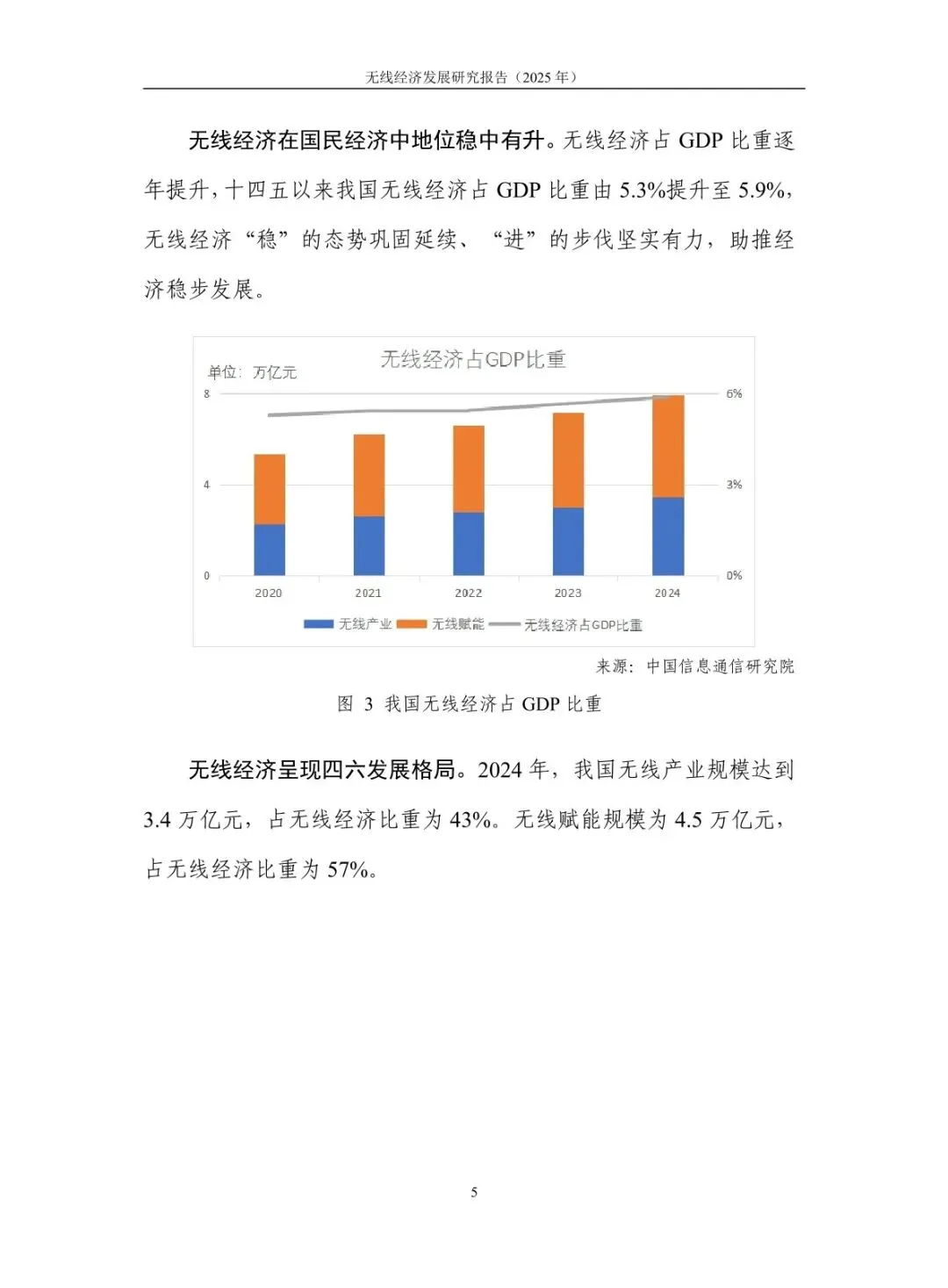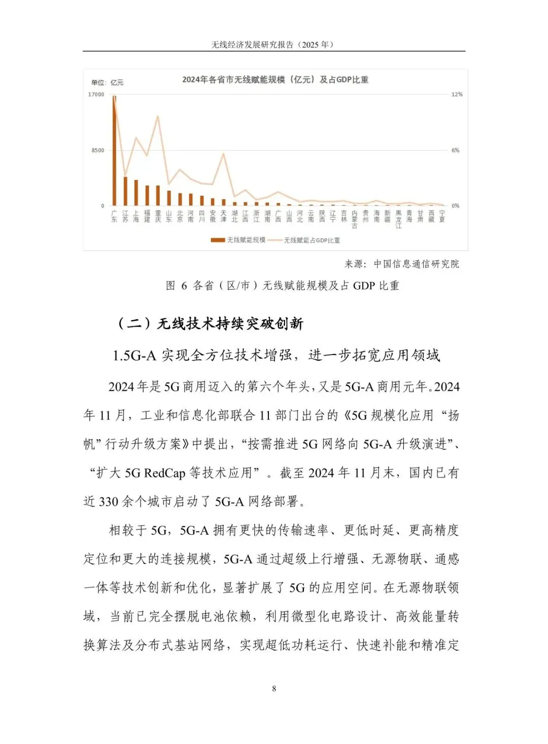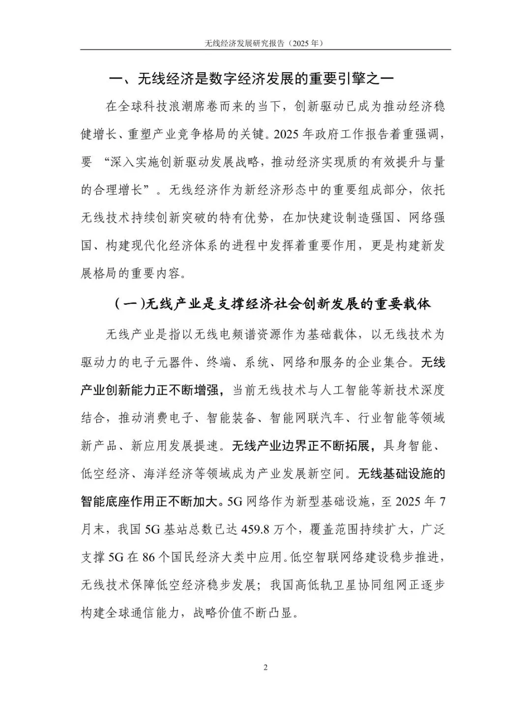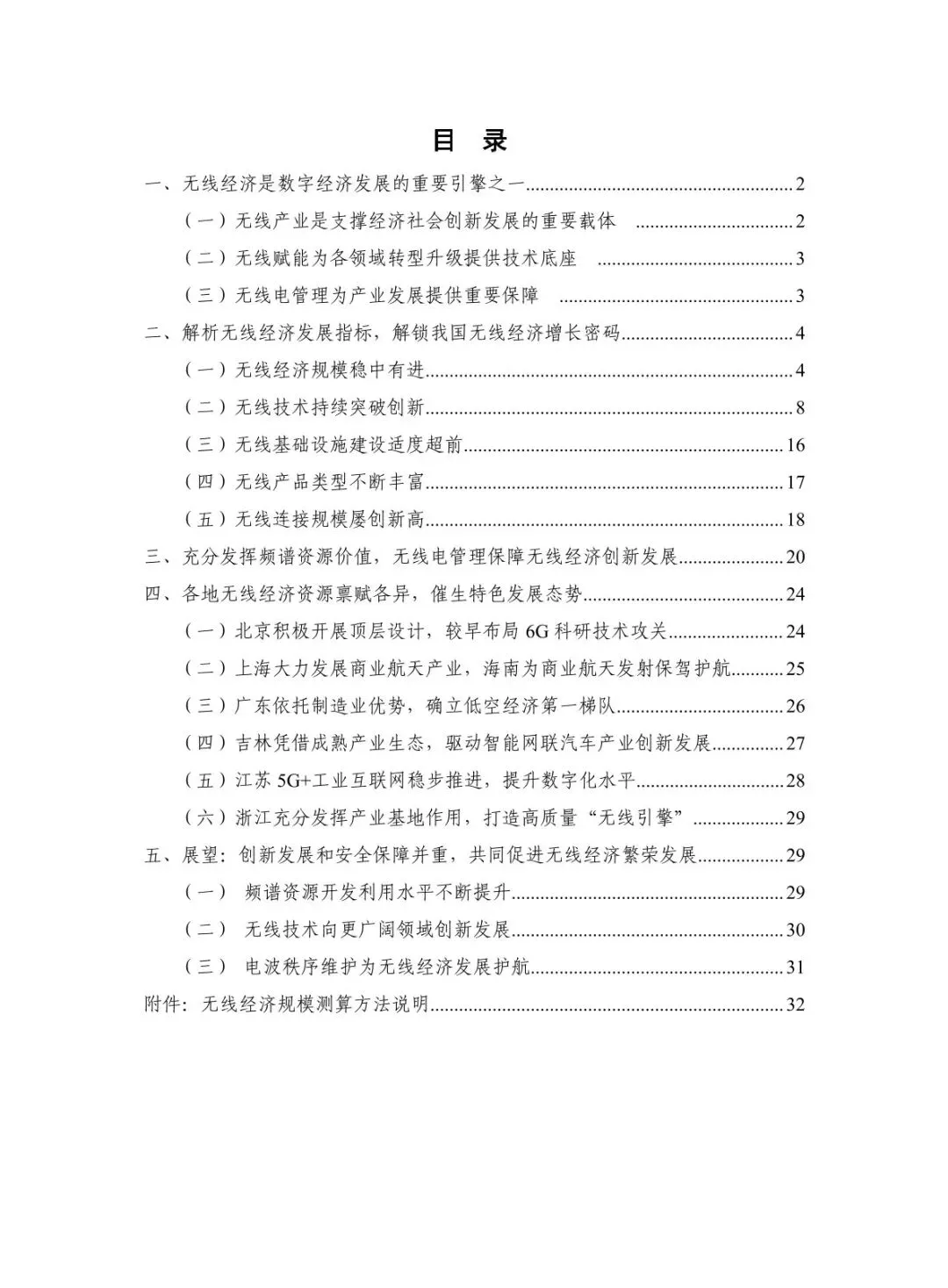 规模稳步增长,结构持续优化:2024 年无线经济规模达 7.9 万亿元,高于同期名义 GDP 增速 6.1 个百分点,占 GDP 比重从 “十四五” 初期的 5.3% 提升至 5.9%。无线产业占比 43%,电子信息制造业与服务业齐头并进,智能手机产量 12.5 亿台、移动物联网业务收入增长 13.3%;无线赋能占比 57%,5G 融入 86 个国民经济大类,“5G + 工业互联网” 项目超 1.85 万个,赋能各行业数字化转型。 核心技术突破,创新应用拓展:5G-A 实现全方位增强,330 余个城市启动部署,无源物联、通感一体等技术推动场景规模化;6G 技术攻关取得进展,“智简内生 6G 原型系统” 实现 6.6Gbps 传输速率,3GPP 启动标准化研究。低空经济市场规模预计 2025 年达 1.5 万亿元,政策与技术双轮驱动;商业航天加速发展,“千帆星座”“吉林一号” 等组网推进,手机直连卫星技术迈入大众消费市场。 基础设施超前,覆盖持续完善:截至 2025 年 7 月末,5G 基站达 459.8 万个,占移动电话基站总数 36%,实现 “乡乡通 5G”。5G 行业虚拟专网超 5.5 万个,应用案例累计超 13.8 万个。车联网建设成效显著,建成 17 个示范区、7 个先导区,开放测试道路超 2.2 万公里,C-V2X 车载终端安装量超 100 万套,支撑智能网联汽车发展。 区域特色鲜明,差异化发展:北京超前布局 6G 研发,建设创新产业集聚区与公共研发试验平台;上海大力发展商业航天,支持卫星互联网技术研发与星座建设;广东依托制造业优势,构建低空经济产业链,省级低空飞行管理服务平台上线;吉林聚焦智能网联汽车,建成 “车路云一体化” 试验线路,探索寒地解决方案;江苏推进 5G + 工业互联网,5G 工厂数量全国第一。 频谱资源赋能,治理保障有力:工业和信息化部出台多项频谱政策,重耕 3GHz 以下频段支持 5G 发展,协调卫星频率资源保障发射任务。各地无线电管理机构精准服务,北京开展频谱经济效益评估,海南保障商业航天发射无线电安全,江苏开展车联网频段专项监测。未来将提升频谱开发利用水平,推动无线技术向空天一体、通智一体、通感一体发展,强化电磁空间安全保障。