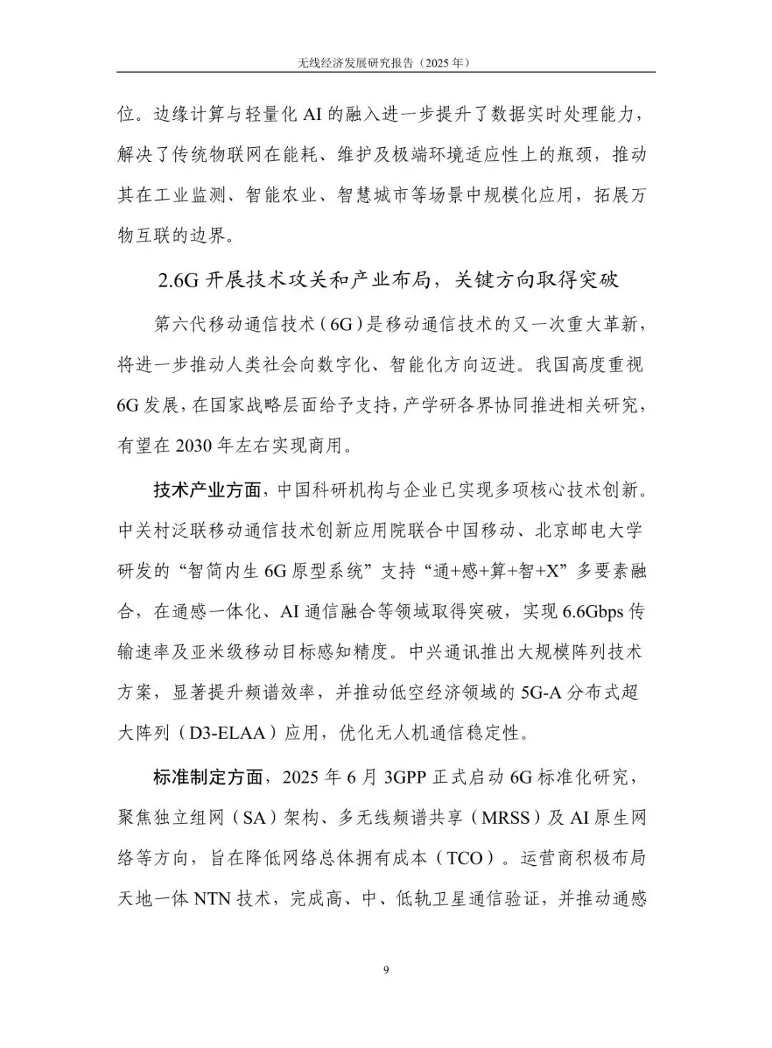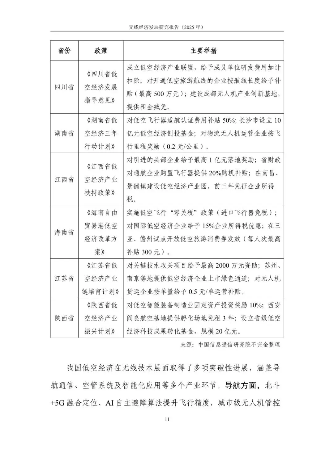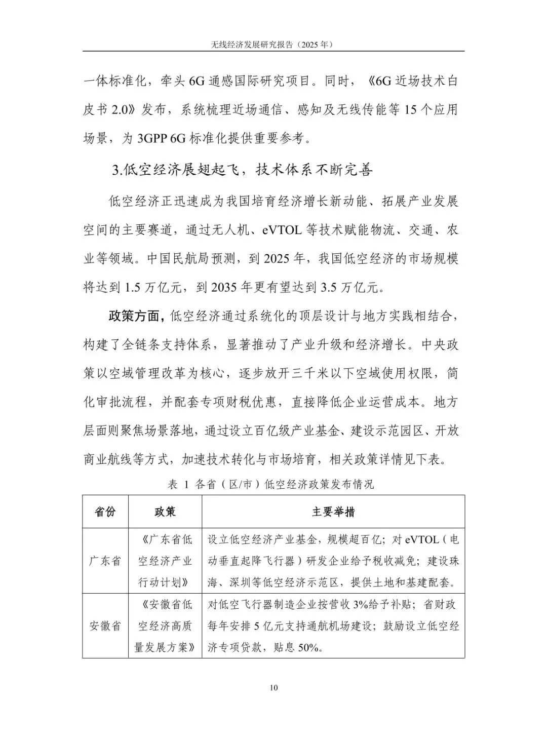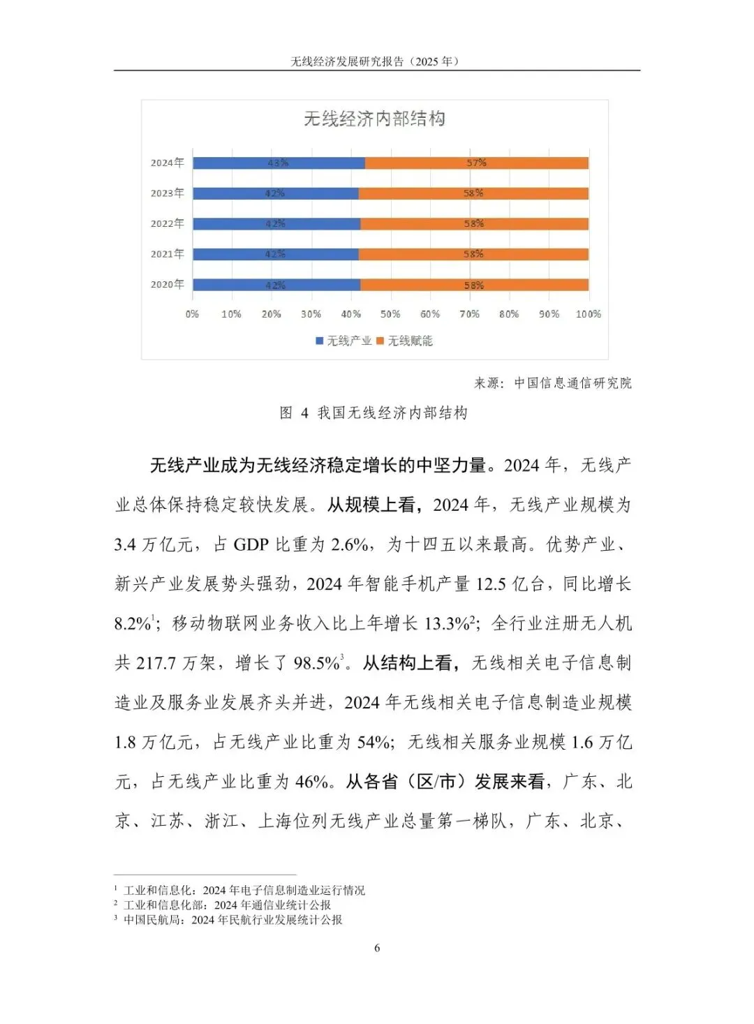 规模稳步增长,结构持续优化:2024 年无线经济规模达 7.9 万亿元,高于同期名义 GDP 增速 6.1 个百分点,占 GDP 比重从 “十四五” 初期的 5.3% 提升至 5.9%。无线产业占比 43%,电子信息制造业与服务业齐头并进,智能手机产量 12.5 亿台、移动物联网业务收入增长 13.3%;无线赋能占比 57%,5G 融入 86 个国民经济大类,“5G + 工业互联网” 项目超 1.85 万个,赋能各行业数字化转型。 核心技术突破,创新应用拓展:5G-A 实现全方位增强,330 余个城市启动部署,无源物联、通感一体等技术推动场景规模化;6G 技术攻关取得进展,“智简内生 6G 原型系统” 实现 6.6Gbps 传输速率,3GPP 启动标准化研究。低空经济市场规模预计 2025 年达 1.5 万亿元,政策与技术双轮驱动;商业航天加速发展,“千帆星座”“吉林一号” 等组网推进,手机直连卫星技术迈入大众消费市场。 基础设施超前,覆盖持续完善:截至 2025 年 7 月末,5G 基站达 459.8 万个,占移动电话基站总数 36%,实现 “乡乡通 5G”。5G 行业虚拟专网超 5.5 万个,应用案例累计超 13.8 万个。车联网建设成效显著,建成 17 个示范区、7 个先导区,开放测试道路超 2.2 万公里,C-V2X 车载终端安装量超 100 万套,支撑智能网联汽车发展。 区域特色鲜明,差异化发展:北京超前布局 6G 研发,建设创新产业集聚区与公共研发试验平台;上海大力发展商业航天,支持卫星互联网技术研发与星座建设;广东依托制造业优势,构建低空经济产业链,省级低空飞行管理服务平台上线;吉林聚焦智能网联汽车,建成 “车路云一体化” 试验线路,探索寒地解决方案;江苏推进 5G + 工业互联网,5G 工厂数量全国第一。 频谱资源赋能,治理保障有力:工业和信息化部出台多项频谱政策,重耕 3GHz 以下频段支持 5G 发展,协调卫星频率资源保障发射任务。各地无线电管理机构精准服务,北京开展频谱经济效益评估,海南保障商业航天发射无线电安全,江苏开展车联网频段专项监测。未来将提升频谱开发利用水平,推动无线技术向空天一体、通智一体、通感一体发展,强化电磁空间安全保障。