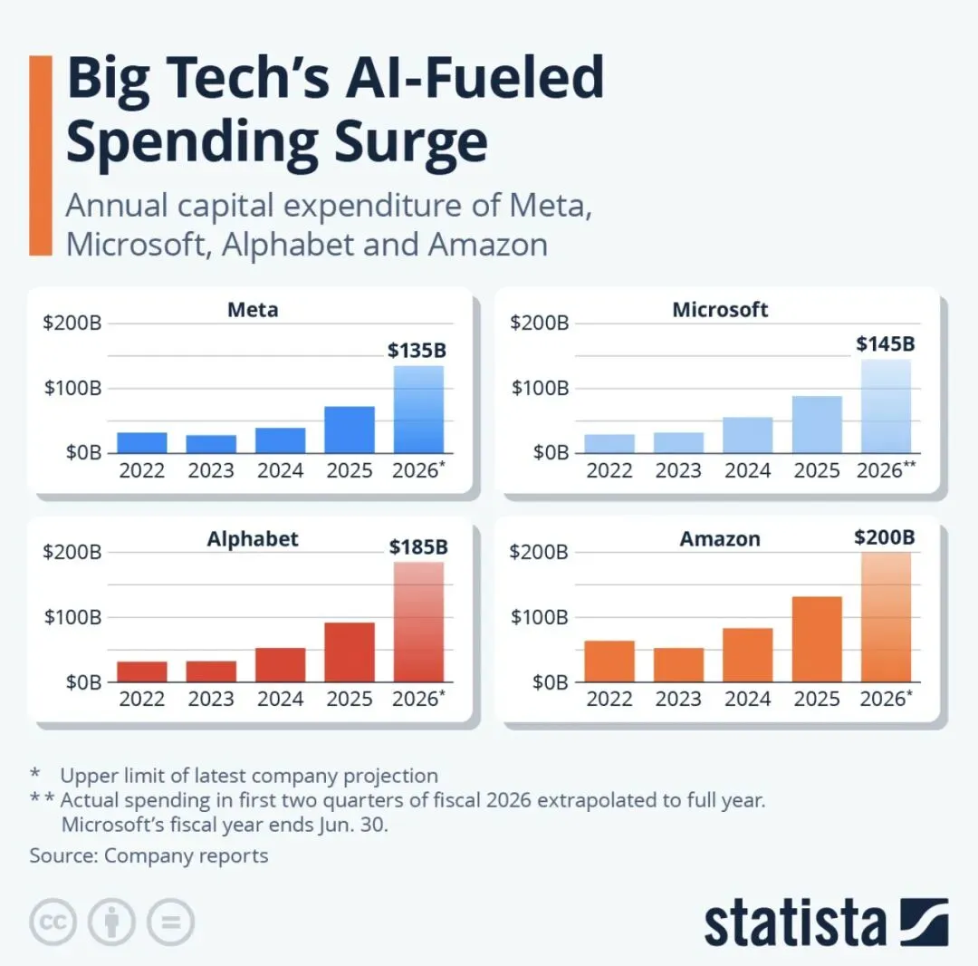 其实逻辑很清晰: 上一季度数据中心收入占比已达90%。只要下游亚马逊、微软、谷歌、Meta等科技巨头的资本开支不松动。这里已知的几家科技巨头2026年资本开支预计接近7000亿美元,其中大约75%投向AI基础设施。