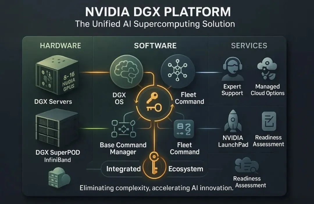 展示整个 DGX 平台如何把硬件(DGX 服务器、SuperPOD)和软件(AI Enterprise、Fleet Command 等)组合成一个完整的全栈解决方案,而不是单独卖芯片。