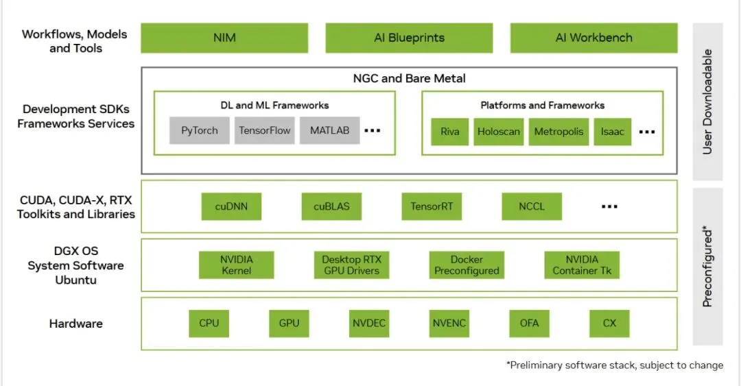 显示从硬件底层到软件库、框架再到平台工具的完整生态,说明英伟达把“整个生态”打包给客户,不止是单芯片