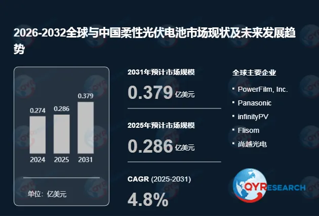 根据QYR(恒州博智)的统计及预测,2025年全球柔性光伏电池市场销售额达到了0.29亿美元,预计2031年将达到0.379亿美元,年复合增长率(CAGR)为4.8%(2025-2031)。