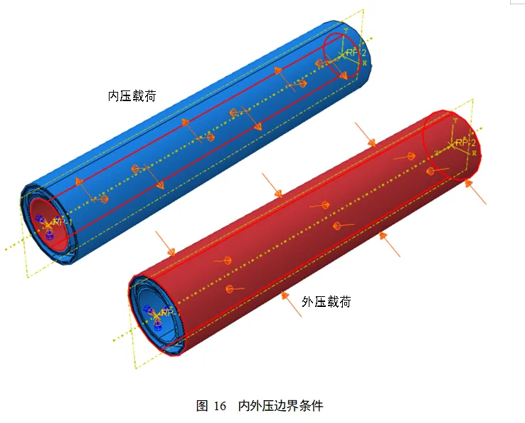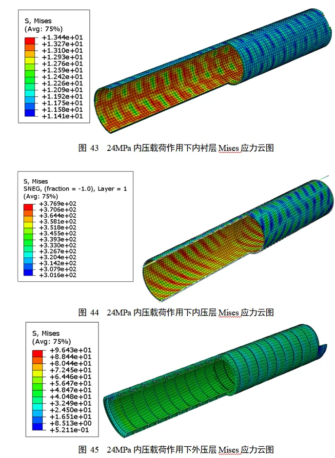 2、通过仿真模拟可以得到,在内压载荷、外压载荷及拉伸载荷作用下,分别由内压层、外压层及抗拉层主要承受载荷,能够满足各功能层的设计要求。目前设计的6寸非金属柔性管在设计工作压力12MPa、设计外压载荷10MPa及拉伸载荷作用下能够满足强度要求。