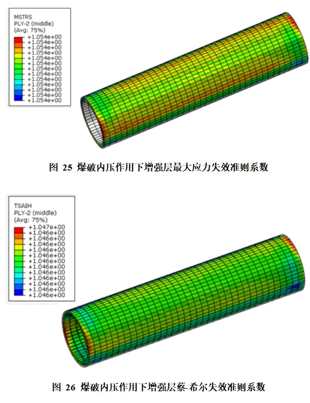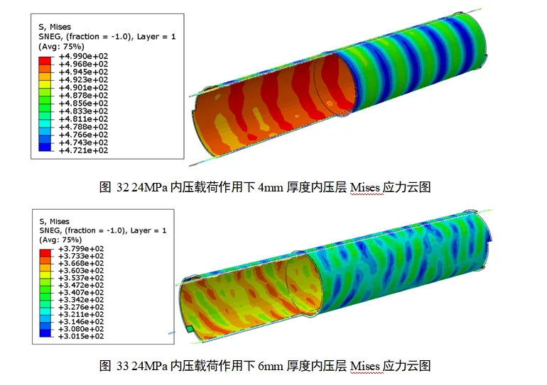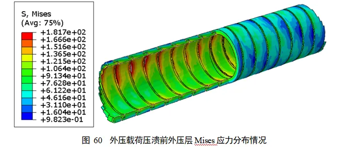 图60为外压载荷压溃前外压层Mises应力分布情况,可以看到外压增强层的Mises应力为181.7MPa,已达到外压增强层材料的强度极限。