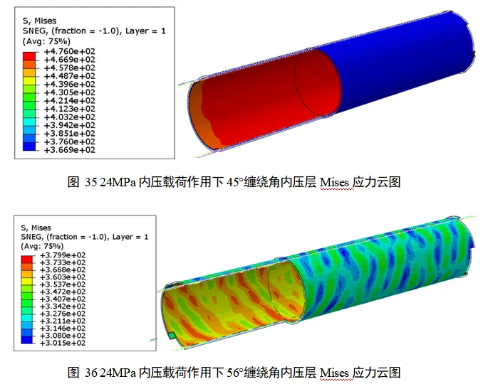 不同缠绕角度下内压增强层的Mises应力云图如图35至图37所示。可以看到,在24MPa内压载荷作用下,45°缠绕角度的内压层Mises应力为476MPa,56°缠绕角度的内压层Mises应力为379.9MPa,60°缠绕角度的内压层Mises应力为391.7MPa。在56°缠绕角度下内压增强层Mises应力最小,因此建议选取内压层缠绕角度为56°。