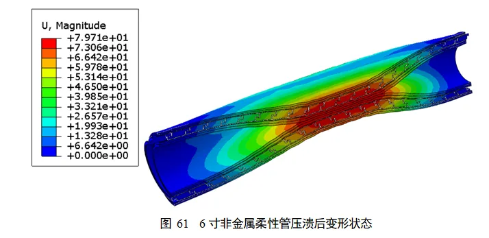 图61为6寸非金属柔性管压溃后变形状态,可以看到当外压载荷达到压溃载荷时,柔性管会突然失去承载能力,发生显著的压溃变形。