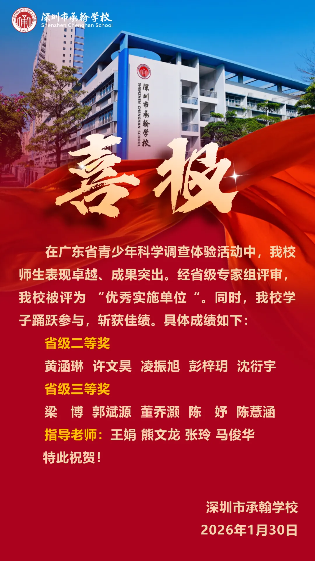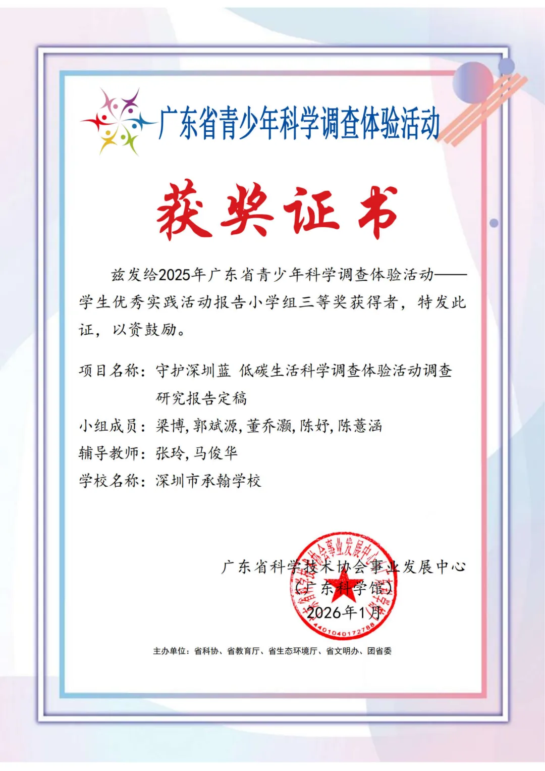 在 2025 年度广东省青少年科学调查体验活动中,由梁博,郭斌源,董乔灏,陈妤,陈薏涵同学完成,马俊华、张玲老师指导的《守护深圳蓝 —— 低碳生活科学调查体验活动》研究报告,凭借扎实的实践探究、详实的内容呈现斩获省级三等奖!这份荣誉,是对同学们科学探究能力的充分肯定,也是实践育人的生动成果。