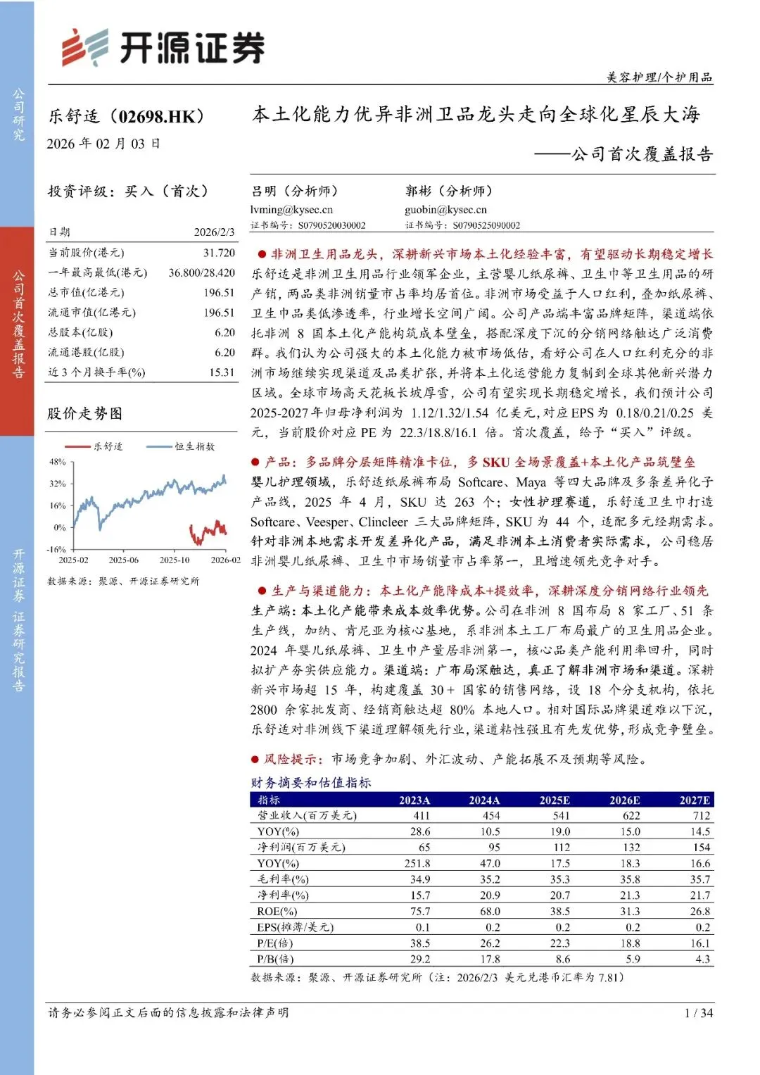 回复暗号:乐舒适(02698.HK)公司首次覆盖报告:本土化能力优异非洲卫品龙头走向全球化星辰大海-260203-开源证券-34页