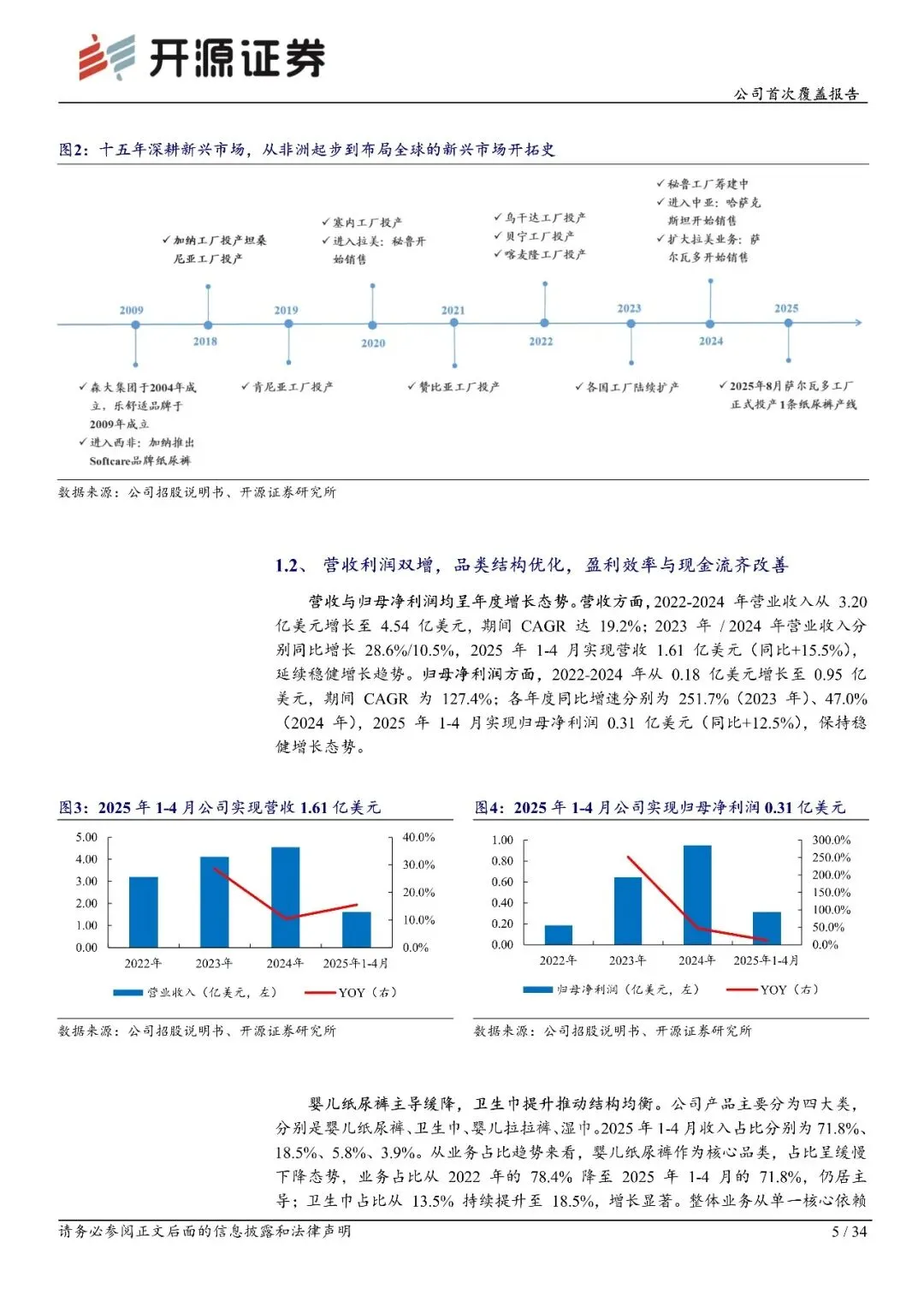 非洲卫生用品龙头,深耕新兴市场本土化经验丰富,有望驱动长期稳定增长乐舒适是非洲卫生用品行业领军企业,主营婴儿纸尿裤、卫生巾等卫生用品的研产销,两品类非洲销量市占率均居首位。非洲市场受益于人口红利,叠加纸尿裤、卫生巾品类低渗透率,行业增长空间广阔。